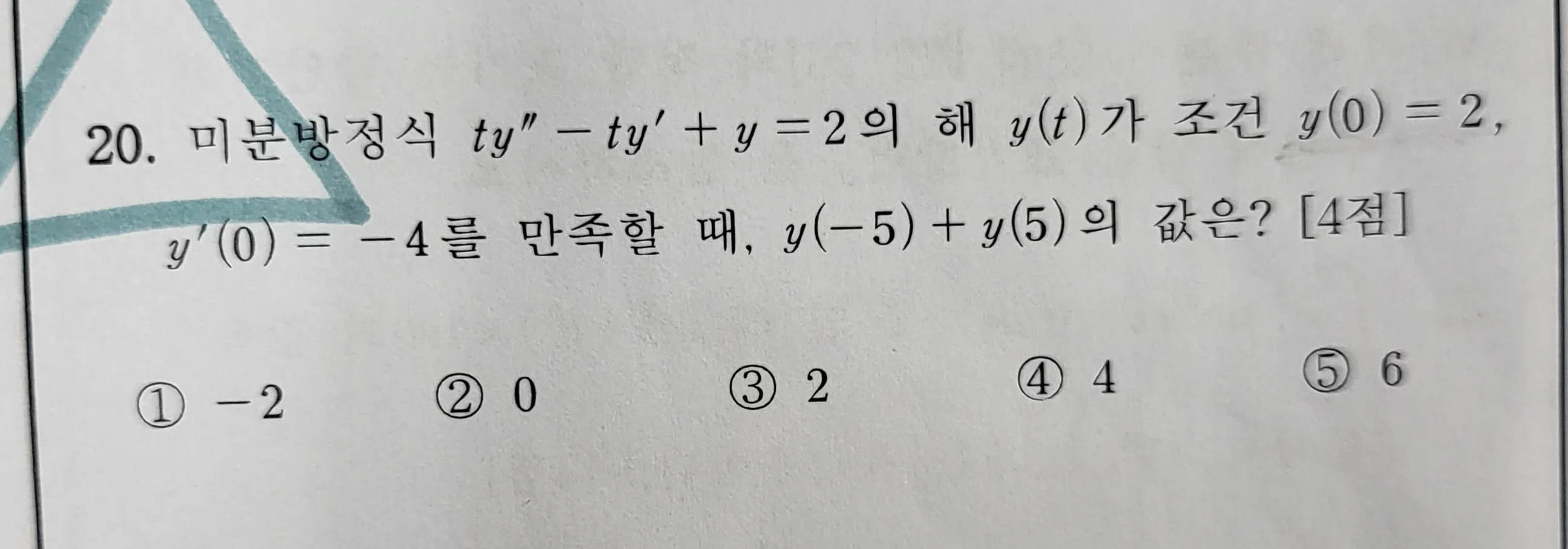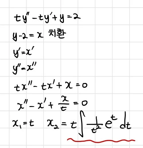 23년 한양대 20번 질문이 있습니다. 주어진 미분방정식에서 y''의 계수가 t라 코시-오일러를 쓸 수가 없고 양변을 t로 나누어 계수 감소법을 사용하려고 했더니 우변에 2가 있어 계수감소법의 형태 y''+p(x)y'+q(x)y=0꼴이 나오지 않아 다음과 같이 y-2=x로 치환하여 식을 정리하고 x1=t로 잡았는데 x2가 적분이 되지 않습니다. 이 문제는 어떻게 풀어야 할까요?