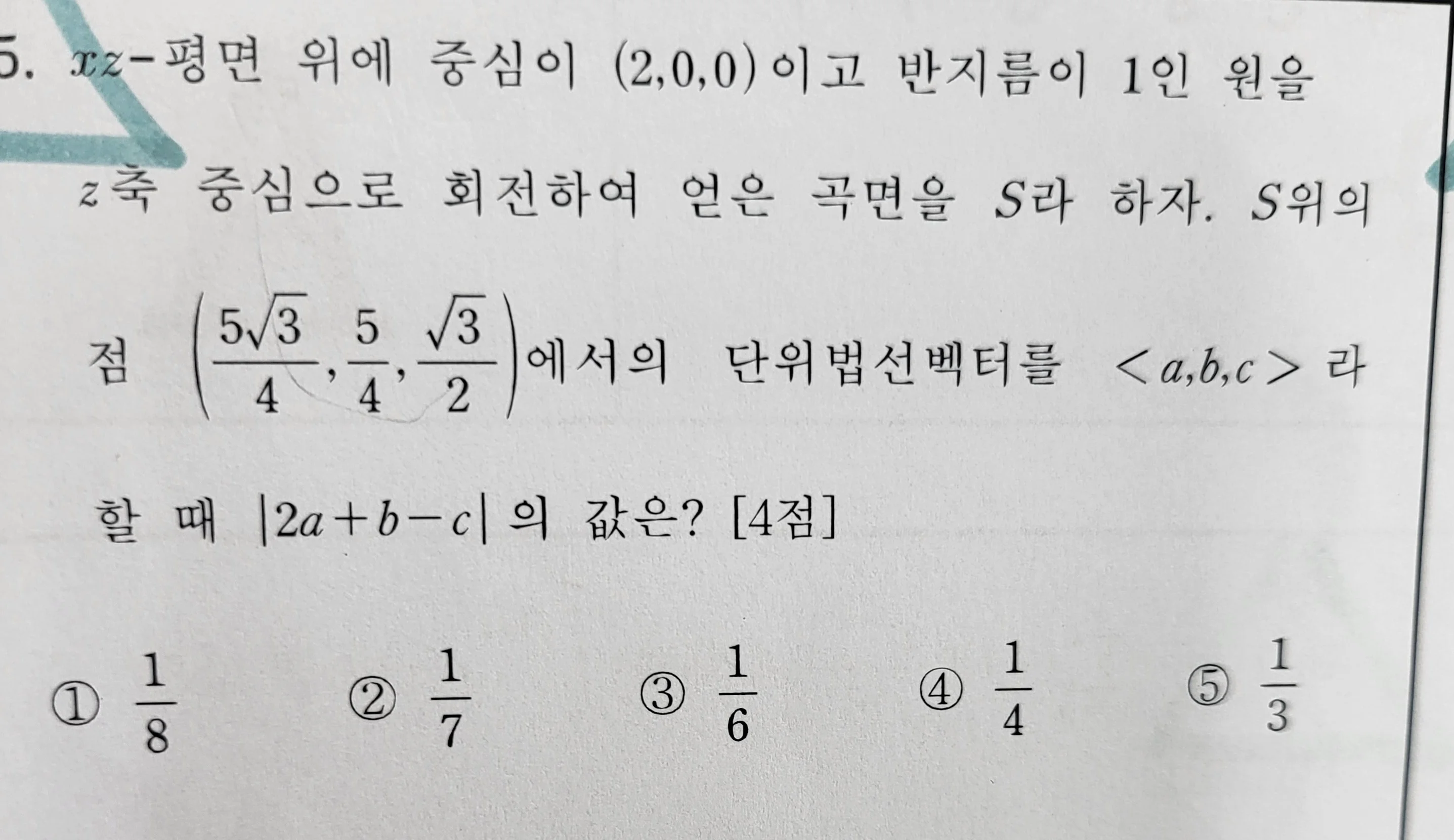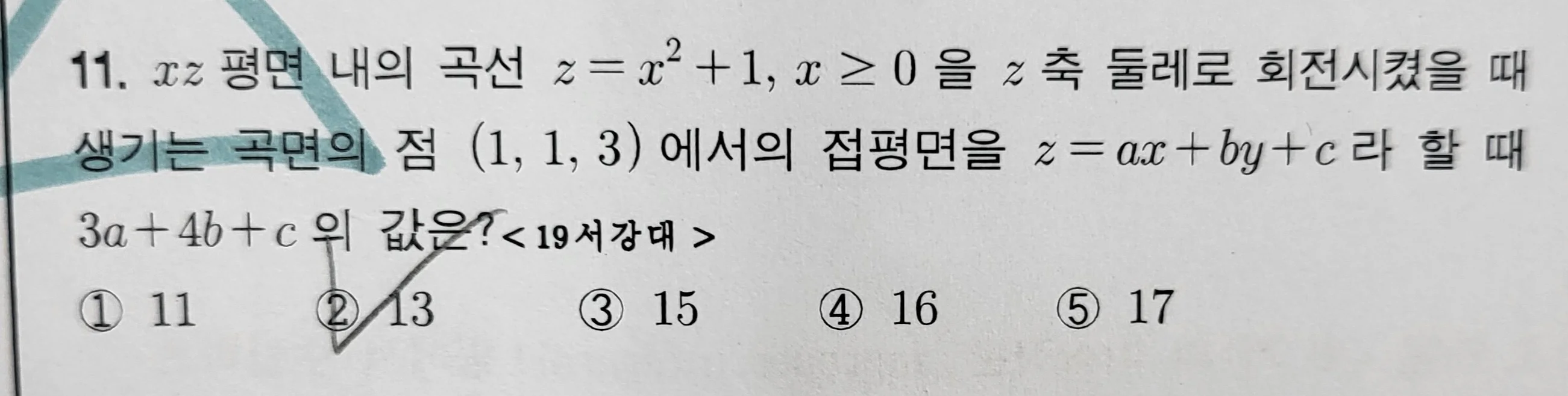 23한양대 5번+19서강대 11번 질문있습니다. 두 문제다 xz 평면위에 있는 곡선을 z축을 중심으로 회전하여 만들어지는 곡면에 대한 문제입니다. 한양대 5번같은 경우에는 원환면의 방정식을 외우고 있어야 풀 수 있는 문제인가요? 서강대 11번은 yz 평면에서 방정식이 z=y^2+1니까 z=x^2+1이랑 더해버리던데 이런 유형의 문제가 나오면 곡면의 방정식을 어떻게 설정해야될지 감이 잘 잡히지 않습니다.