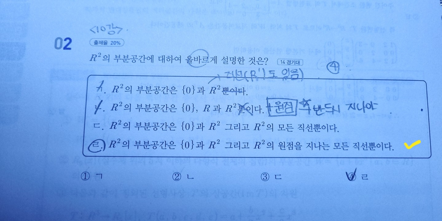 안녕하세요 교수님! 저 286p ㄹ이 궁금한 것이 있습니다. ㄱ은 원점을 지나는 직선 언급과 R1(일차원 직선)이 언급이 안 되어 틀렸다고 하셨습니다! 거기까지는 이해가 가는데, ㄹ에서 R2(이차원)에서는 왜 R1(일차원)이 포함되어 있다는 말이 언급이 안 되었는데 맞는 문장인가요?? R1(일차원 직선)이 부분공간에 포함되어야 하는 것은 아닌가요??