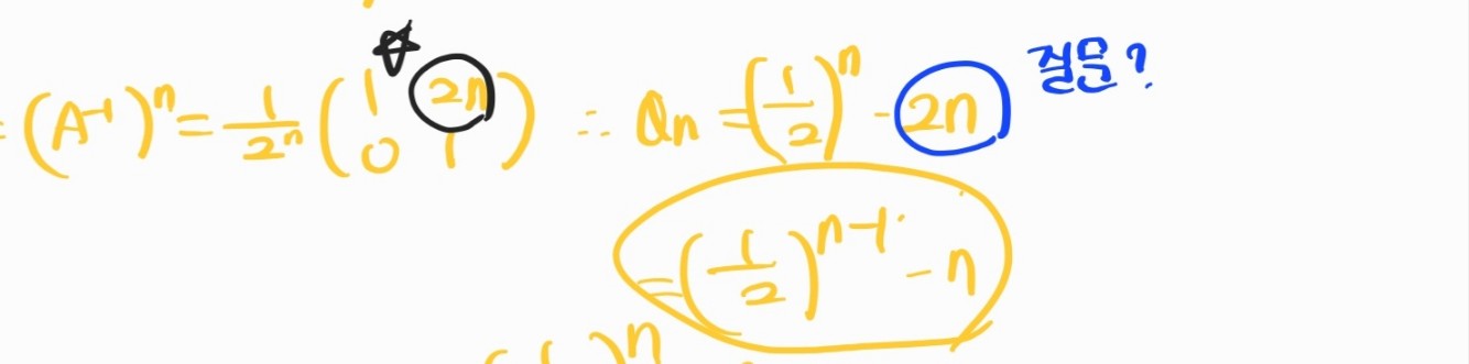 1행 2열의 위치에 2n이 있고 행렬 전체 계수가 1/(2)^n이니 둘이 곱하면 해설에 나온 모양이 됩니다.