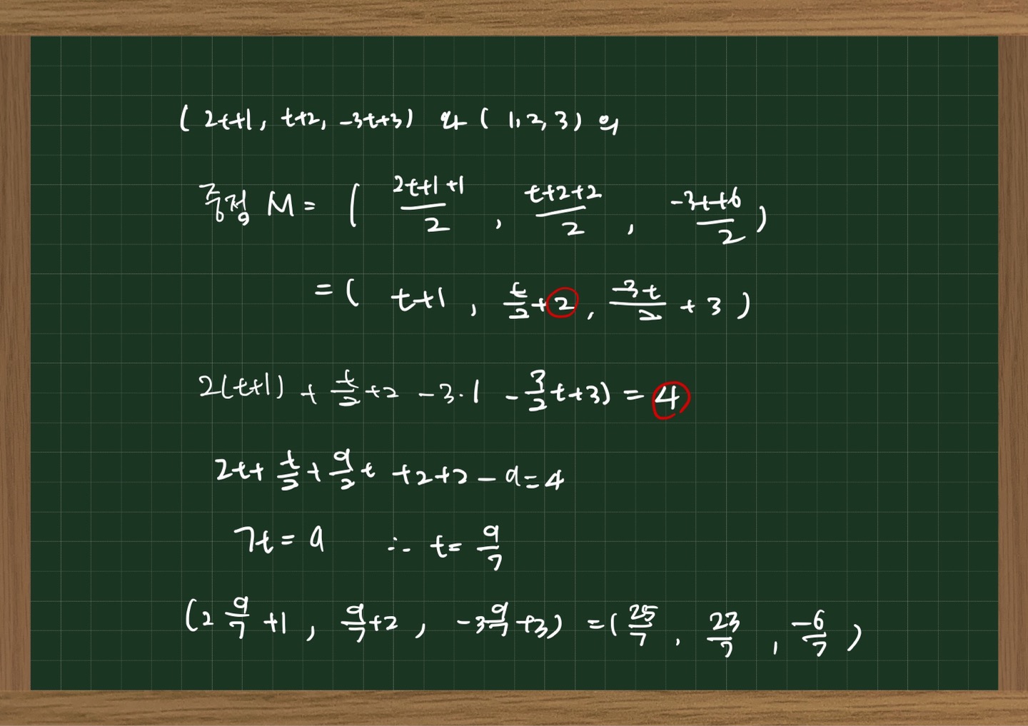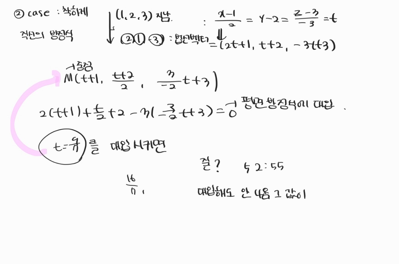 9강 52분 55초에서 t=9/7인 것 까지는 이해가 가는데 교수님께서 t값을 M(t+!. t+2/2, -3/2t+3)의 식에 대입하면 값이 2번으로 나온다고 하셨는데 그렇게 나오지 않아서 궁금해서 질문 드립니다ㅠㅠ