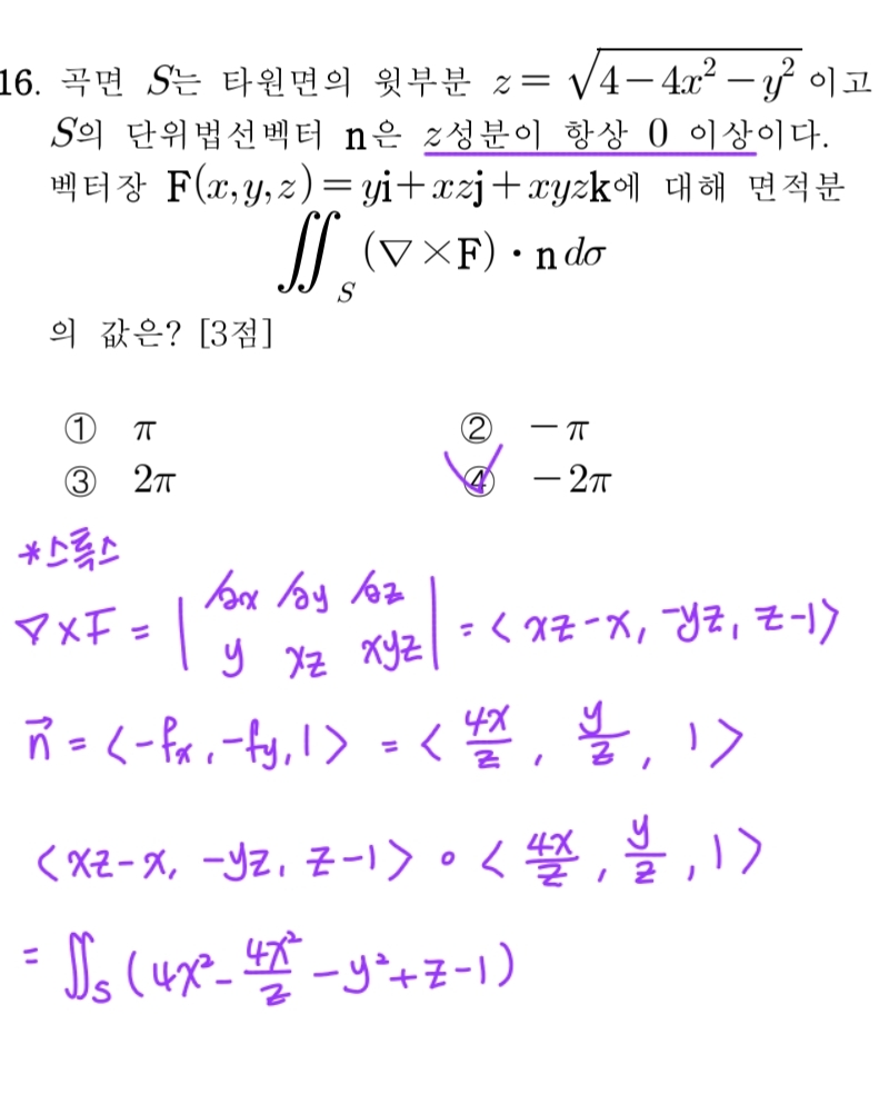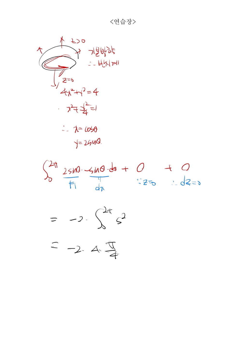 스톡스 정리로 풀어야하는 것같아서 풀어봤는데, 뭔가 이상한 것같아서 교수님께 질문드립니다ㅠㅠ 스톡스 정리로 푸는게 맞는 걸까요? 그리고 가능하시다면 풀이과정 부탁드리겠습니다.