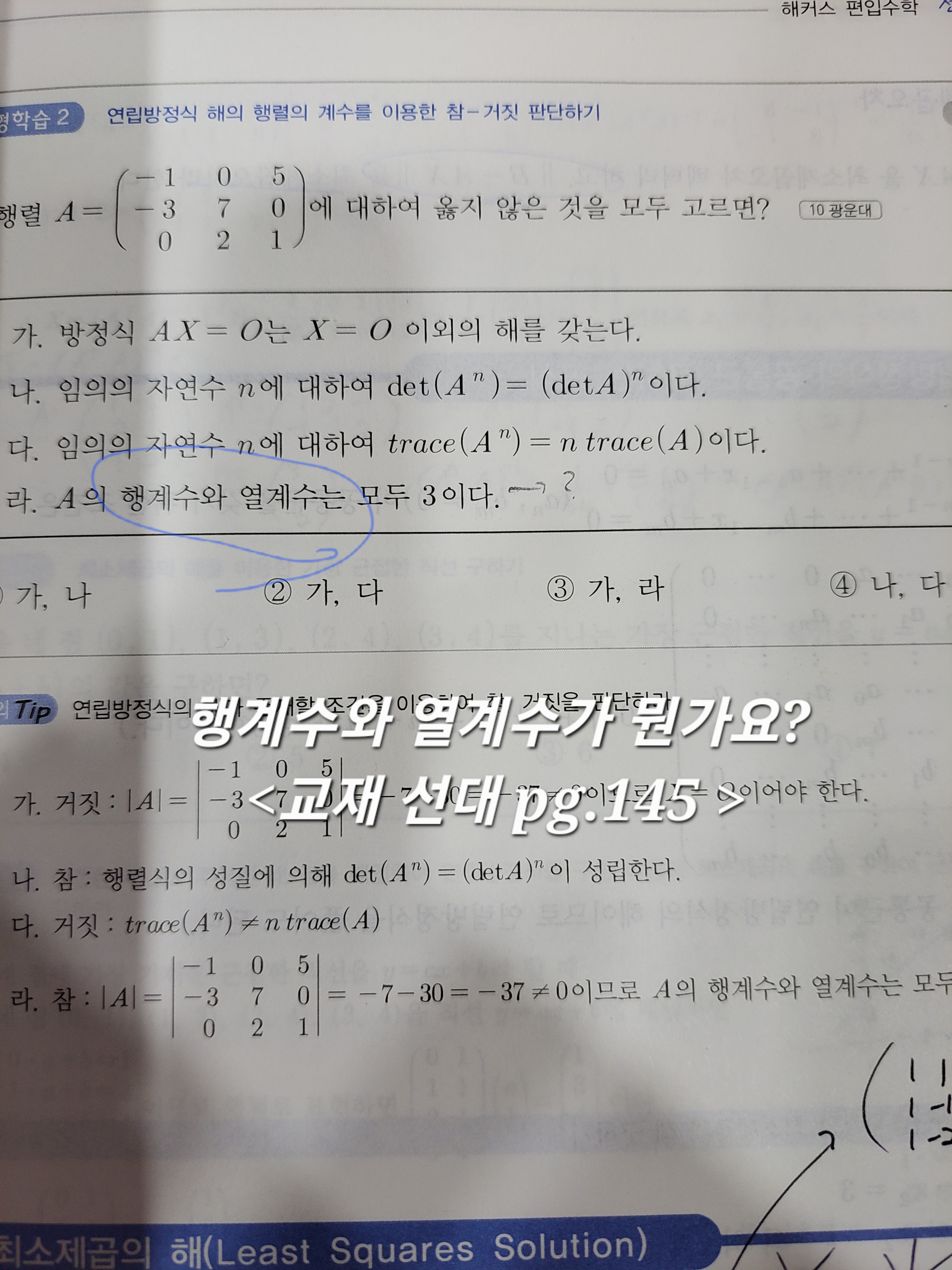 그리고 마지막 한 질문은 중대 5개년을 돌려보니까 종속과 독립 판단문제를 2문제가 있어서 재질문한 이 문제도 그렇고 저번에도 올렸었는데 애초에 일대응대응으로 실수배해서 독립과 종속 판단을 할 수 있지 않나요? 물론 벡터 하나하나마다 독립이냐 종속이냐하면 랭크나 행렬식을 이용해서 써야되지만 물어보고 있는게 전체적으로 봤을때 전체적으로 독립이냐 종속이냐를 물어본 것이잖아요. 전체적으로!! 전체적으로 독립이면 모든 벡터가 다 독립이고 종속이면 비록 전체적으로는 다 종속이지만 그 세부적인 것까지는 다 종속이 아니다 독립도 있다라고 분명히 정규수업에서 말씀해주신 기억이 납니다. 그렇게해서 일대일 대응으로 실수배해서 판단했을 때 종속이라면 전체적으로 종속이니까 그렇게 빠르게 판단하면 되는거 아닌가요? 막 랭크나 행렬식으로 이용하는 것보다요! 만약 실수배를 했는데 독립이 나왔다면 빠르게 다른 방법을 이용해서 해야 되겠지만요. |