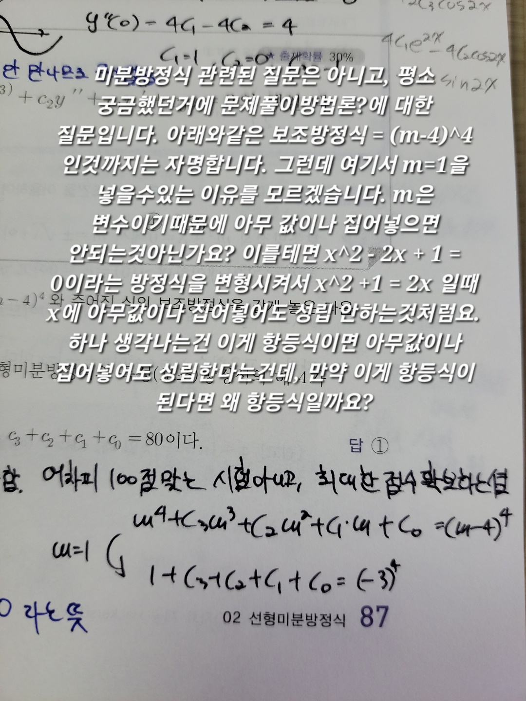 y=e^mx 를 직접 m^4+c3m^3....에 집어넣어 전개 한 것이 (m-4)^4 입니다.