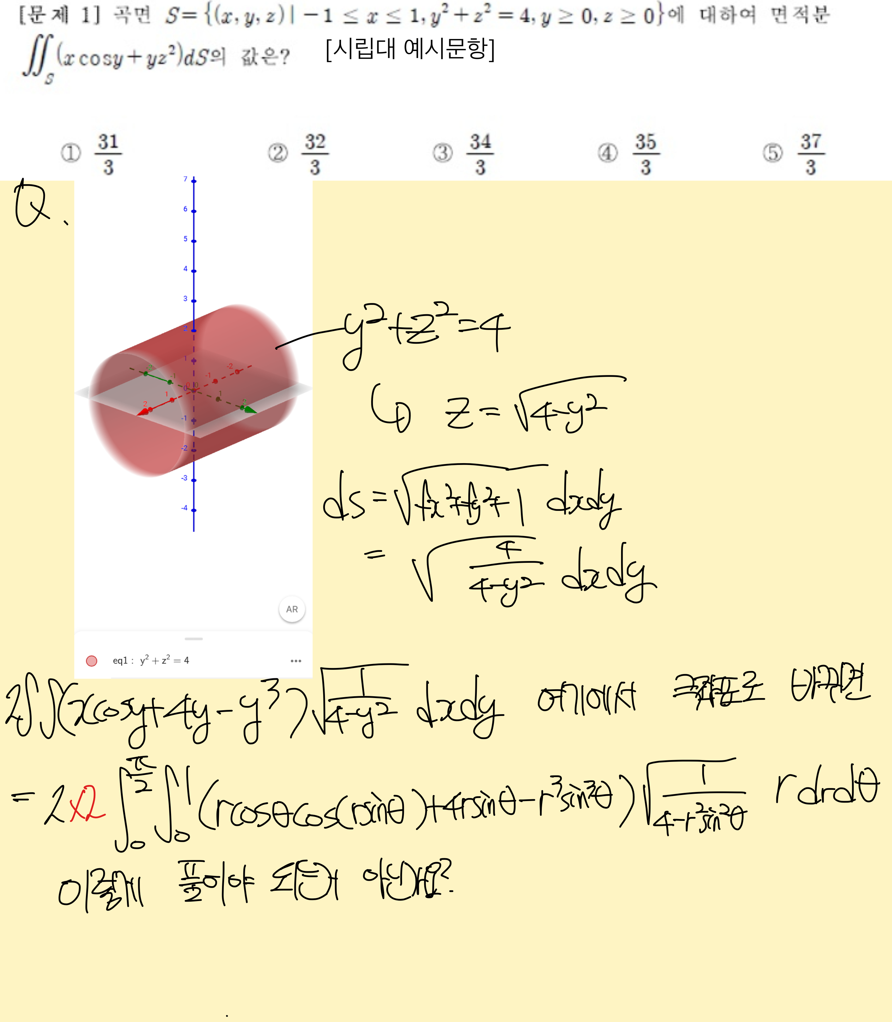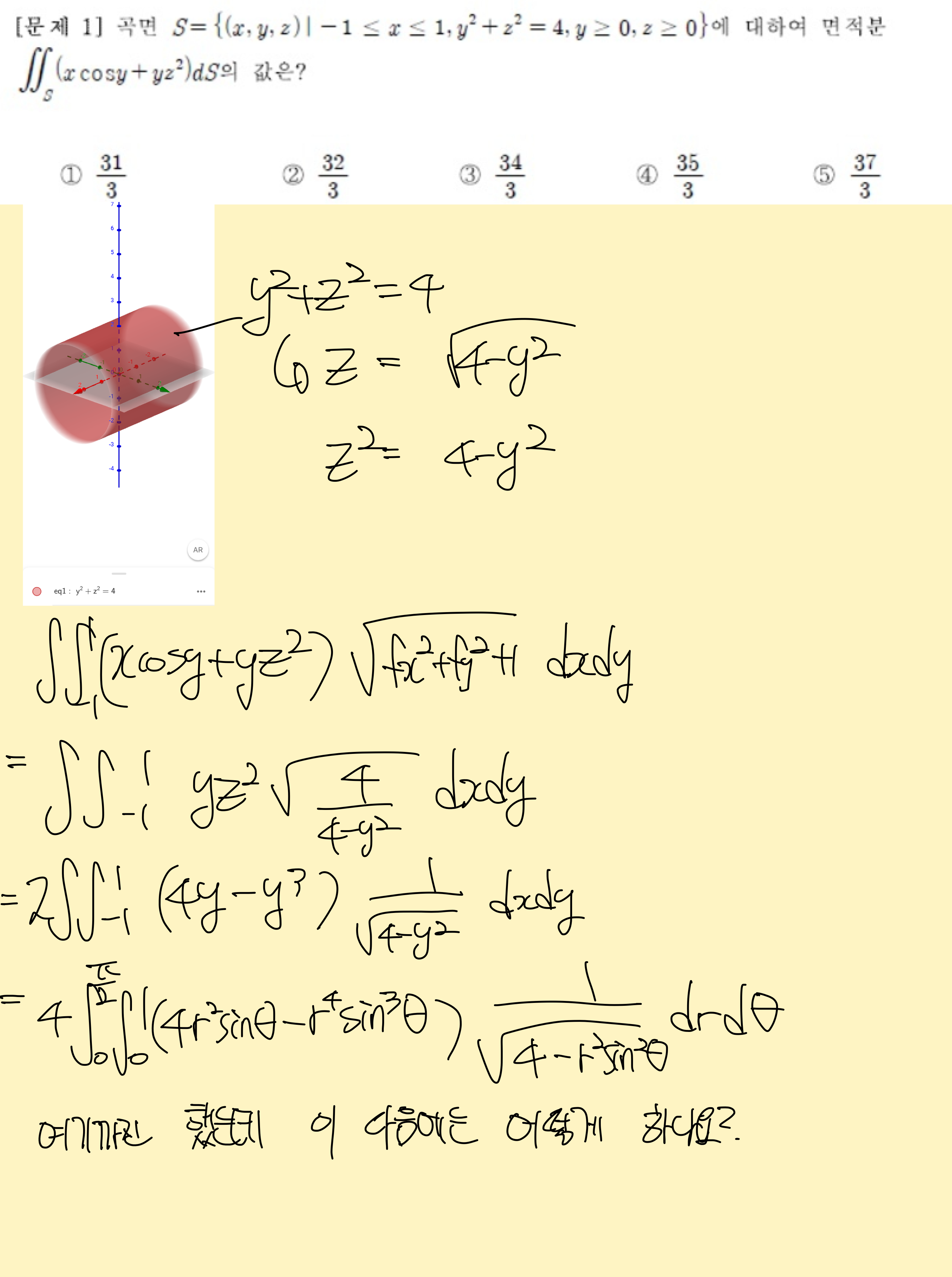 면적분이라서 ds를 root(fx^2+fy^2+1)dxdy로 바꿔주고 z^2=4-y^2이니까 z=root(4-y^2)이고 이걸 x로 편미분해서 제곱 y로 편미분해서 제곱 그리고 1을 더하면 root(fx^2+fy^2+1)dxdy이 되고 이걸 극좌표로 바꿔줘서 풀어야 되는거 아닌가요? 뭔가 이렇게 풀려고 하니까 더 안풀리는 것 같은 매직에 빠져서 질문드려봅니다.