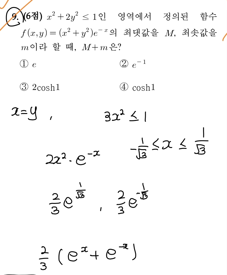 그래서 x의 범위가 나왔는데 뭔가 coshx와 비슷하게 만들수있을거같긴한데 x에 1처럼 간단한 숫자를 대입하는게 아니어서 객관식처럼 못만들겠더라구요.. 모르겠습니다 |