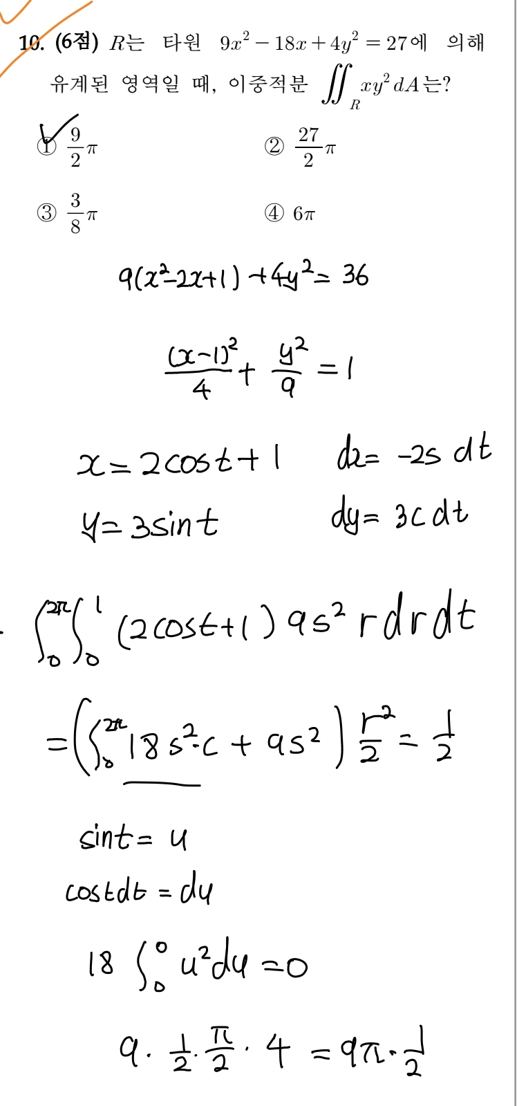 지금 고치려고 생각해보니까 x=2cost+1 이 아니라 그냥 x=2cost를 했어야 됬을거같기도한데