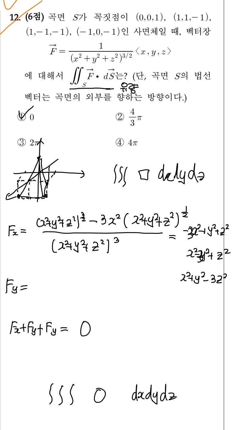 곡면 s가 구 였으면 풀수있을거같은데 사면체라서 삼중적분 범위를 못구하겠습니다.. |