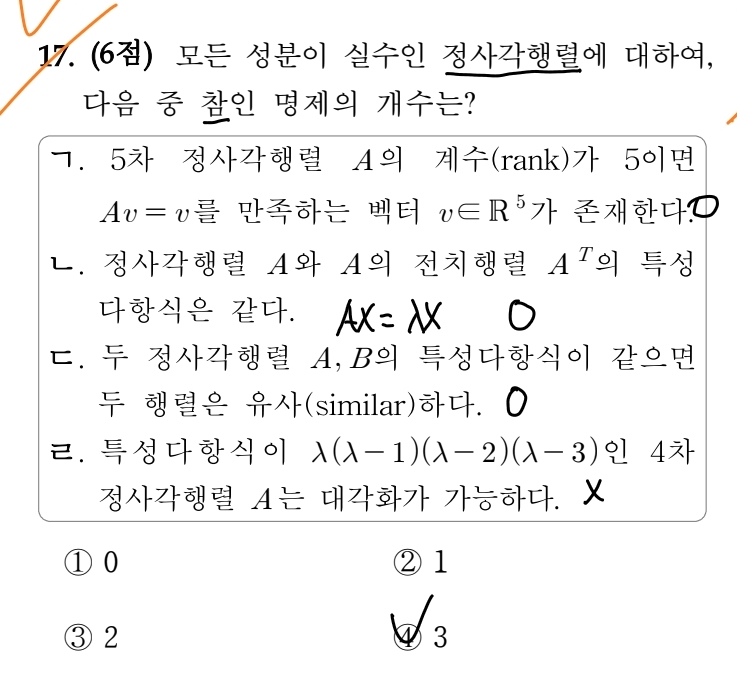 ㄴ은 A^tX 와 AX와 같지 않으니까 다르다고 해야하는건가요? ㄷ은 특성다항식이 같으면 고유치도 같으니까 유사한게 맞다고 생각합니다. ㄹ은 고유치가 다 다르니까 고유벡터도 다 독립하다고 생각하면 P의 행렬식 값이 존재하니까 맞는거 같은데 맞나요? |