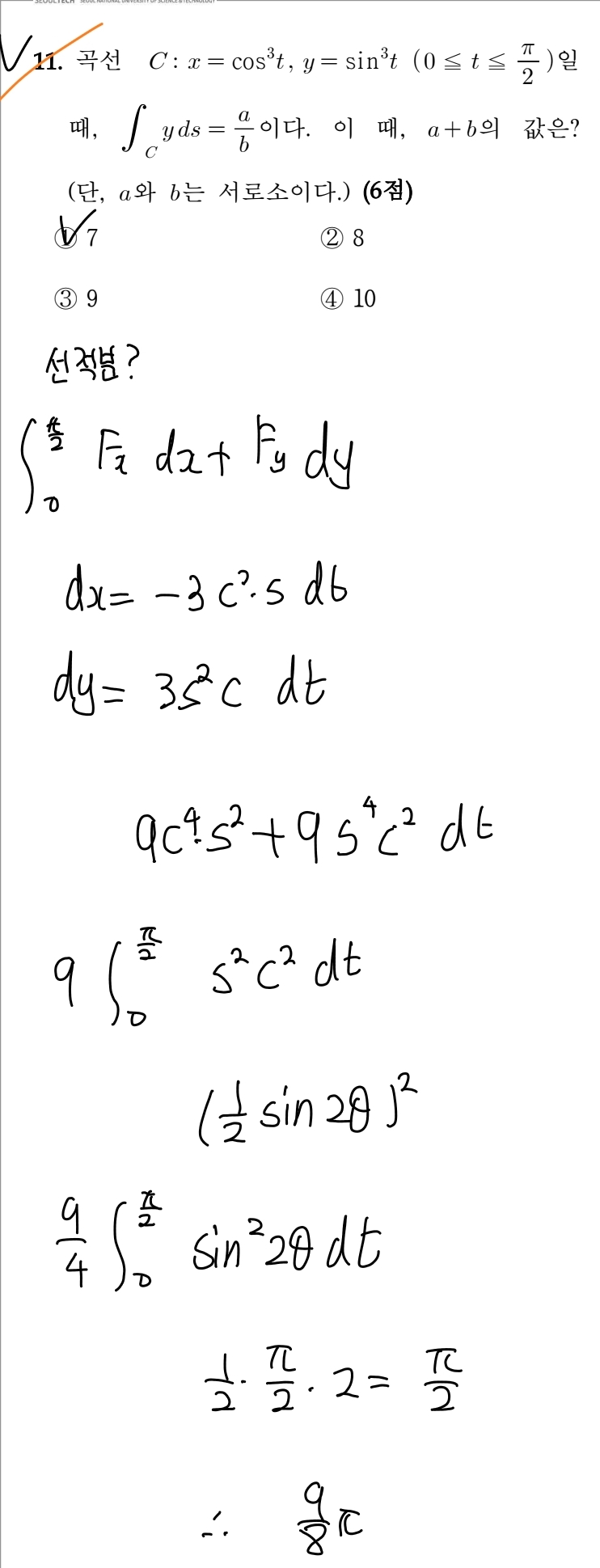 y=sin^3 ds=root(x'^2+y'^2)dt로 적분 풀이해야합니다.