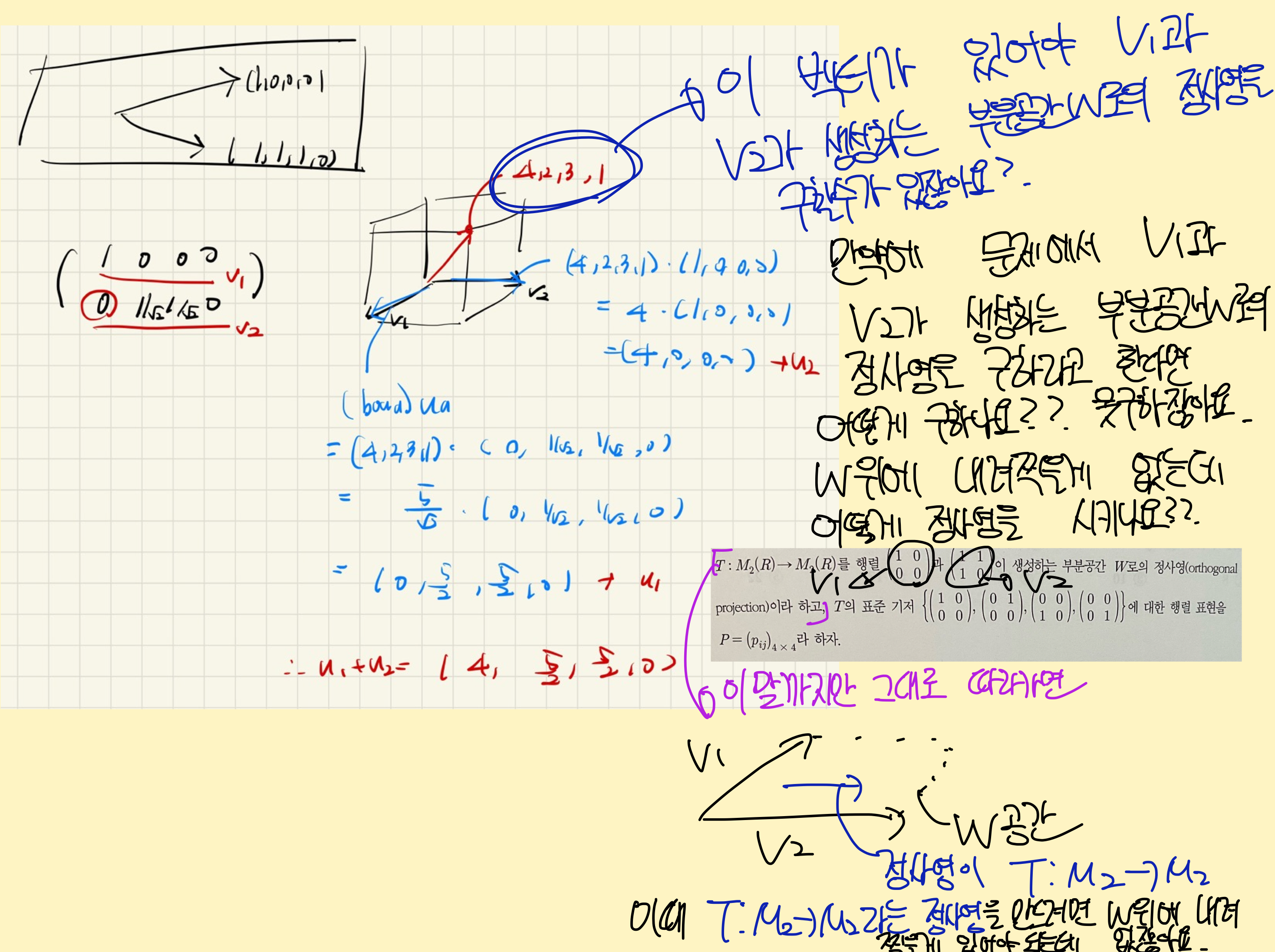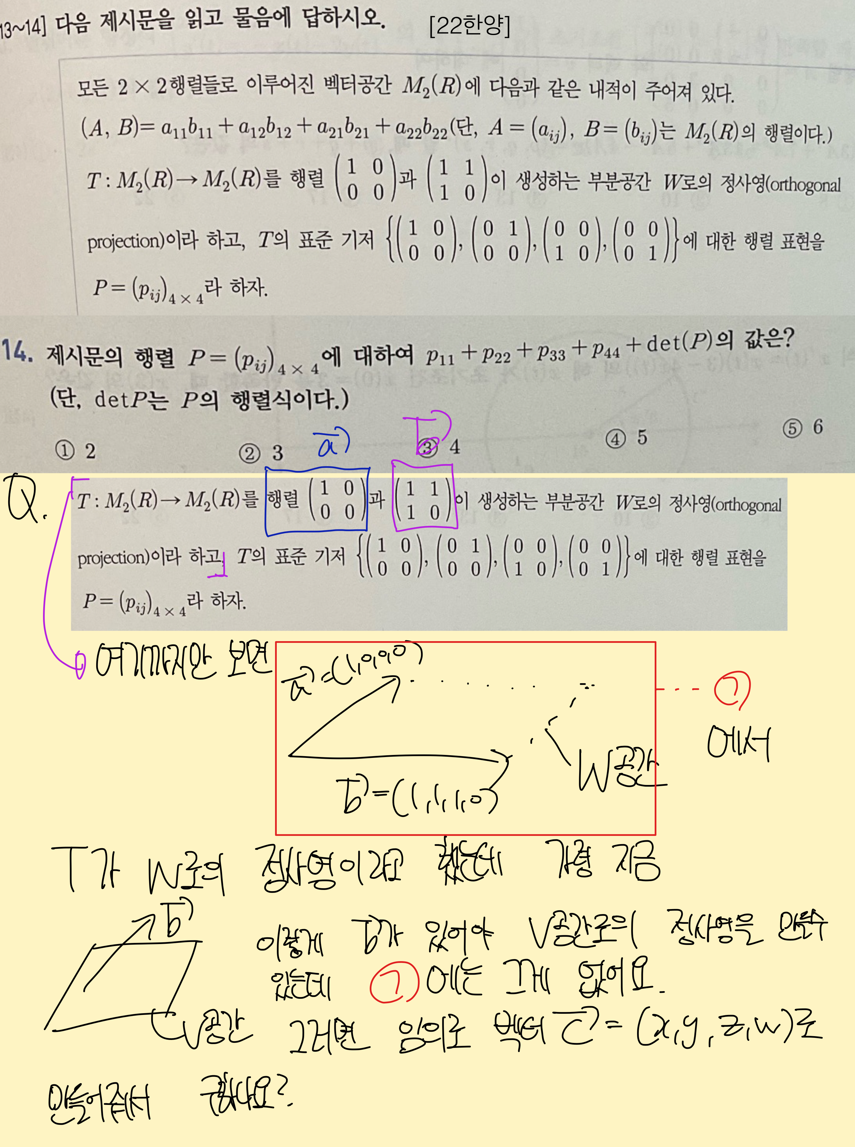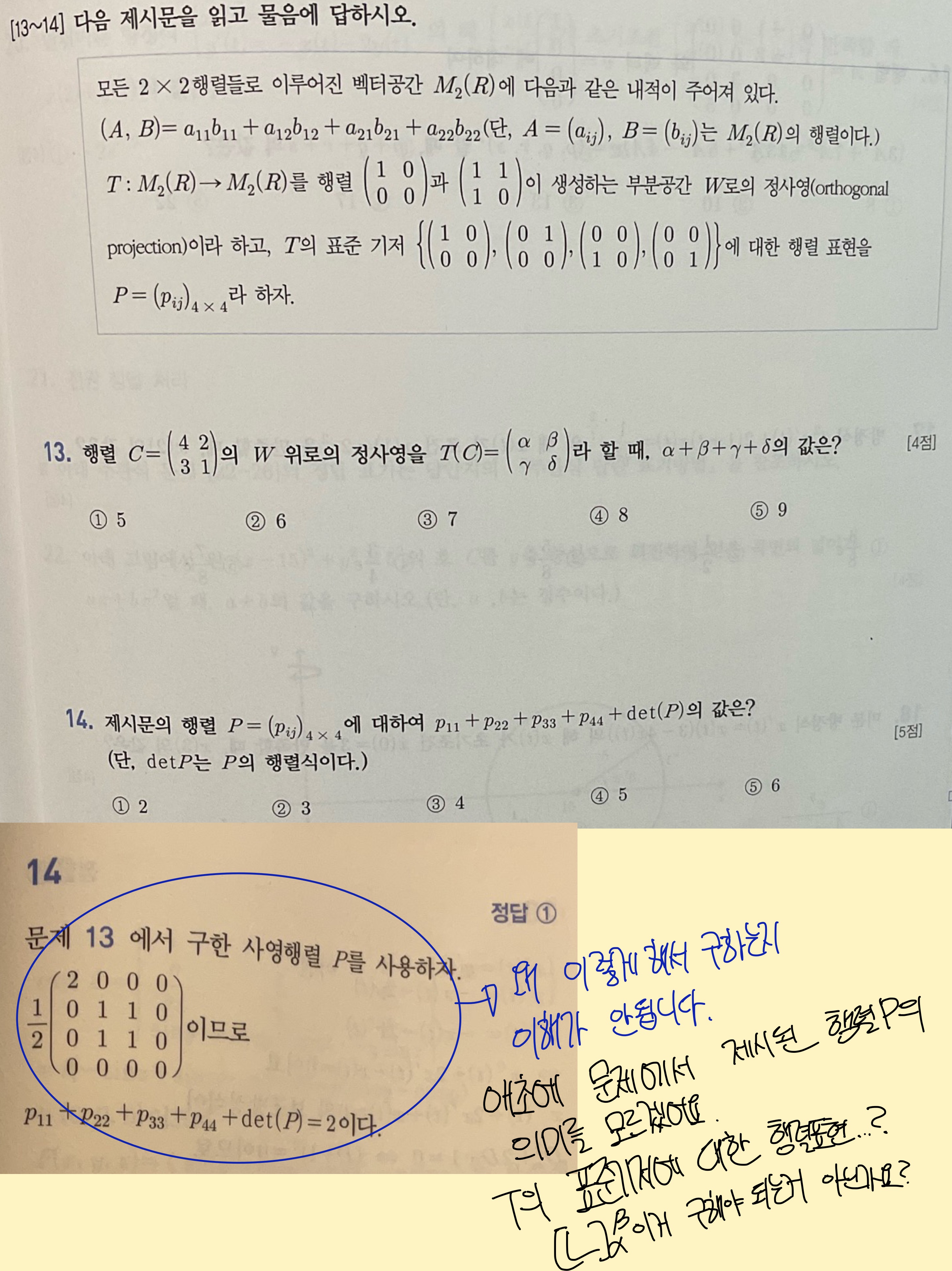 벡터 (4,2,3,1)을 쓰시더라구요 근데 이게 13번에 나와있던 문제였는데 이걸 왜 14번에 쓰는지 모르겠습니다. 벡터(4,2,3,1)을 쓰면 당연히 W로의 정사영을 구할 수가 있겠죠. 하지만 14번에서 정사영T를 구하는데 왜 13번에 나와있는 (4,2,3,1)을 쓰시는지 모르겠습니다. 그래서 제가 이 위에 있는 사진에 보시면 그렇게 적어놨습니다. 정사영을 시키려면 기본적으로 내려찍어야될 벡터가 있어야되는데 13번에는 벡터(4,2,3,1)이 주어져있지만 14번에는 그런 벡터가 주어진게 없고 행렬P를 구하라고 하는데 행렬P가 행렬T의 표준기저에 대한 행렬표현이라고 하는데 행렬T를 구해야 저 표준기저 (1,0,0,0), (0,1,0,0), (0,0,1,0), (0,0,0,1)을 집어넣어서 선형변환시키고 그 값을 (1,0,0,0), (0,1,0,0), (0,0,1,0), (0,0,0,1)에 맞게 실수배시켜서 그걸 다 세로로 쓴 게 행렬P아닌가요? 벡터강의에서 선형변환 마지막에 기저행렬배울때 말씀드리는거에요. 어찌됐든 기저에 대해서 이 기저에 맞게 실수배를 시켜서 P행렬을 구하라!라는 문제가 아닌가요 14번이..?
