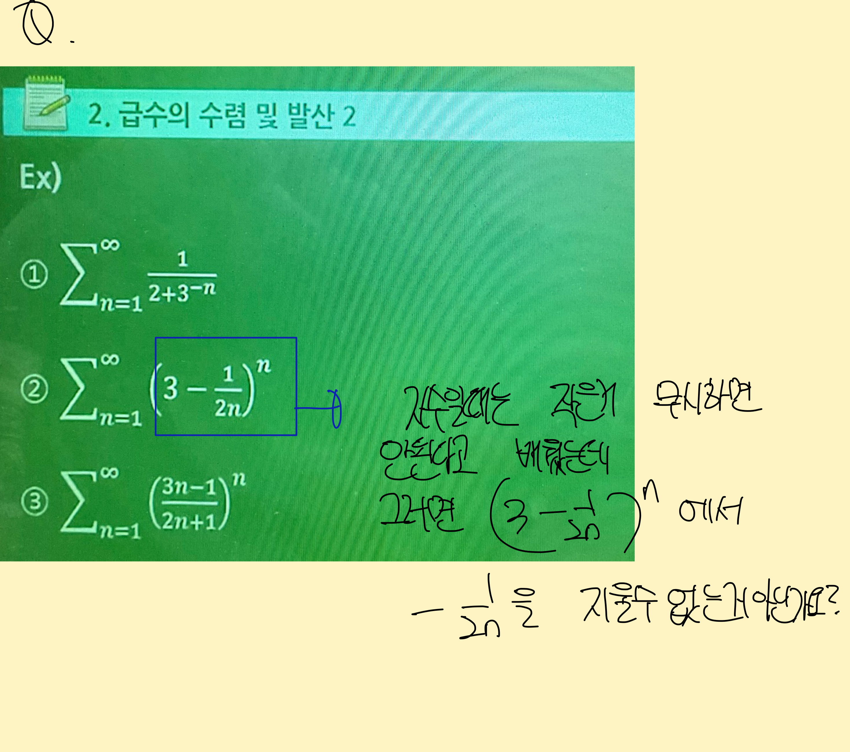안녕하세요 교수님. 다변수 복습하다가 혼동되는 점이 하나 있습니다. 우리가 n->무한대로 갈때 작은거는 무시할 수 있다고 배웠습니다. 가령, x^3+x에서 x가 무한대로 가면 x는 x^3보다 작으므로 지울 수 있다고 하셨어요. 그런데 지수가 달려있을 때 함부로 작은거를 지울 수 없다고 배웠습니다 분명히 가령, (x+3)^x일때 x가 무한대로 가면 3을 지울 수 있을 것 같지만 지울 수 없다고 그러셨습니다. 그런데, 이번에 복습하다가 아래 사진과 같은 내용을 복습하면서 분명히 지수 안에 있고 분명히 -1/2n이 3보다 작은 것은 분명하나 지수에 묶여있기 때문에 지울 수 없는데 왜 지운 것인지가 혼동됩니다 아니면 무한급수할 때만큼은 지수에 묶여도 그냥 작은건 지울까요? 교수님..?