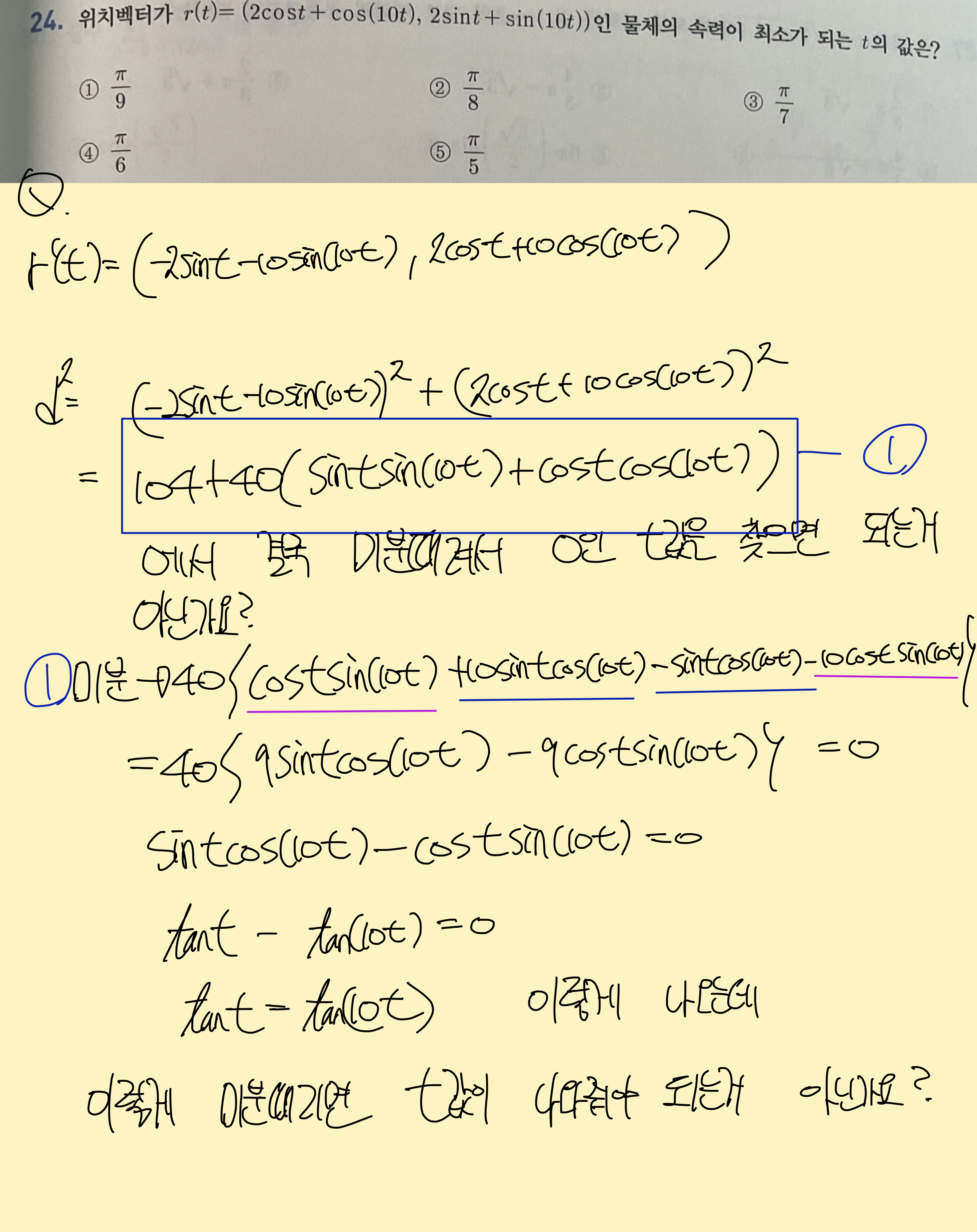 굳이 질문드린 것은 애초에 문제에서 t의 최솟값을 구하라고 했고 보통 최솟값을 구하는 문제 대부분이 미분때려서 0을 만족하는 그 값이 바로 최솟값 또는 최댓값으로 상정하고 풀었는데요. 이 문제 같은 경우에는 위 사진 속에 나와있듯이 잘 안풀리는데 삼각함수에서 최대 최소를 구하려고 미분때리면 좀 잘 안구해지나요 교수님?? |