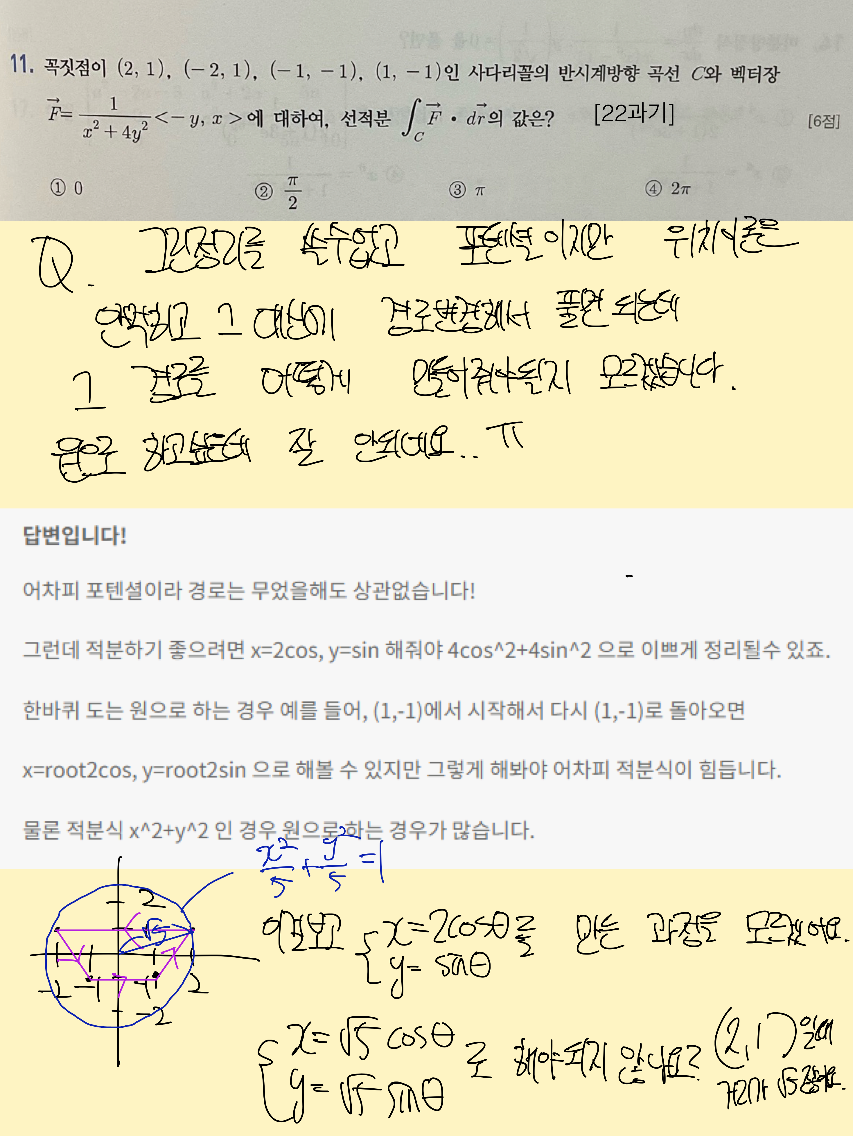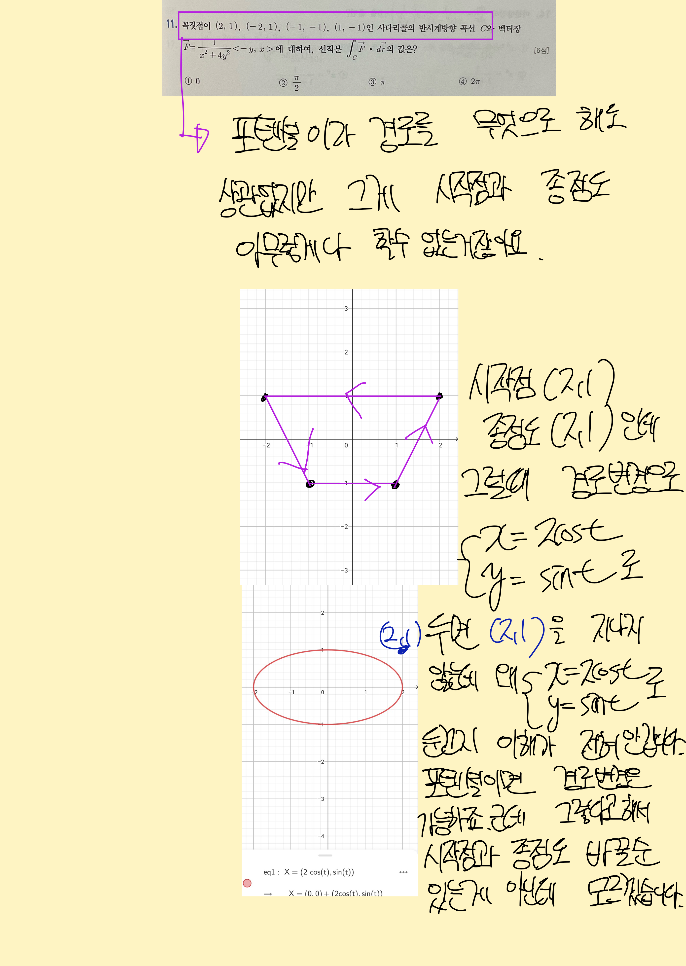 파이널 자료 선적분 19 세종대 문제입니다. 이 선적분은 그린정리도 아니고 포텐셜함수도 아니기 때문에 결국 경로를 t로 설정해서 t에대한 적분을 해야하지 않습니까? 혹시 그래프 한번만 그려주실 수 있습니까? 그리고 이거 어떻게 푸는지 잘 모르겠습니다.