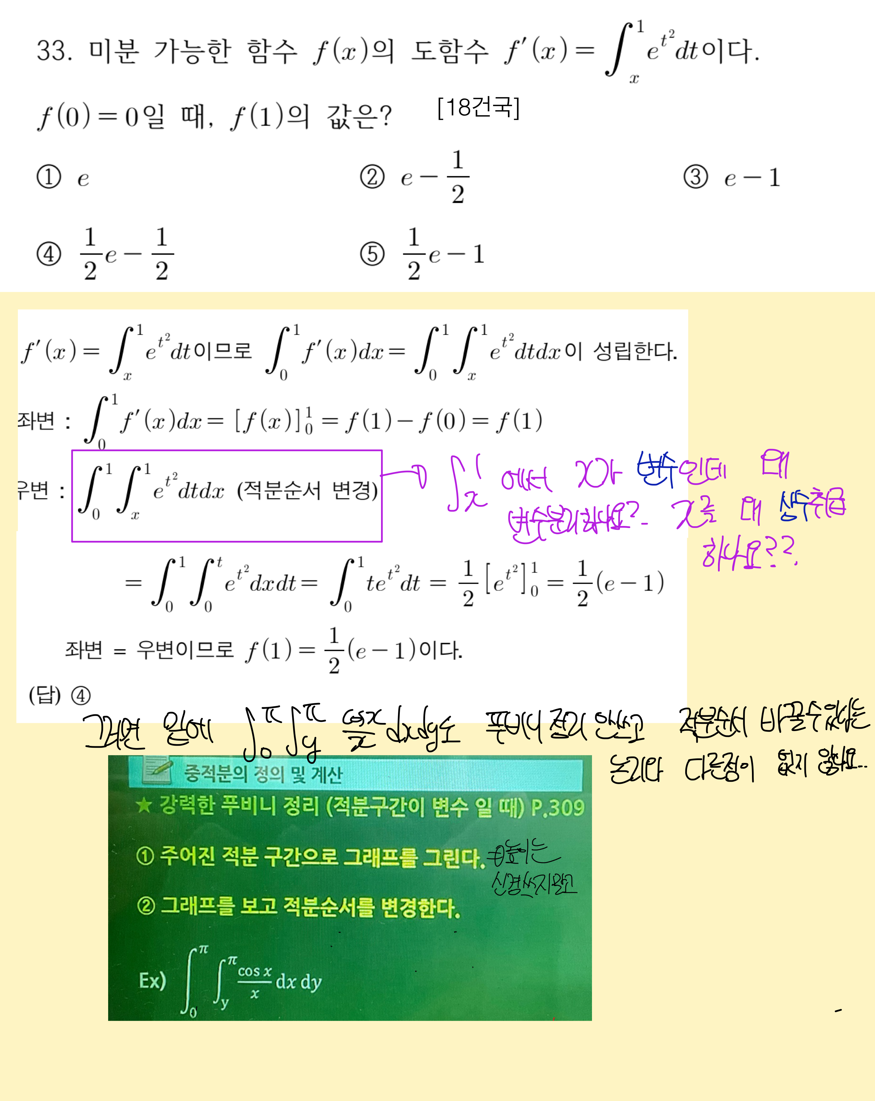 처음에 중적분풀때 푸비니정리쓰려고 그래프를 그려서 dxdy자리를 바꾸려고 했는데 그래프가 그려지지 않아서 이걸 그대로 적분을 해야 되나.. 라는 접근으로 했는데.. 이게 5분정도 잡아먹었는데 이거를 실제 현장에서 풀 수 있는 문제..인건가요? 이거 잘못풀다가 멘탈 갈릴 것 같은데.. |
