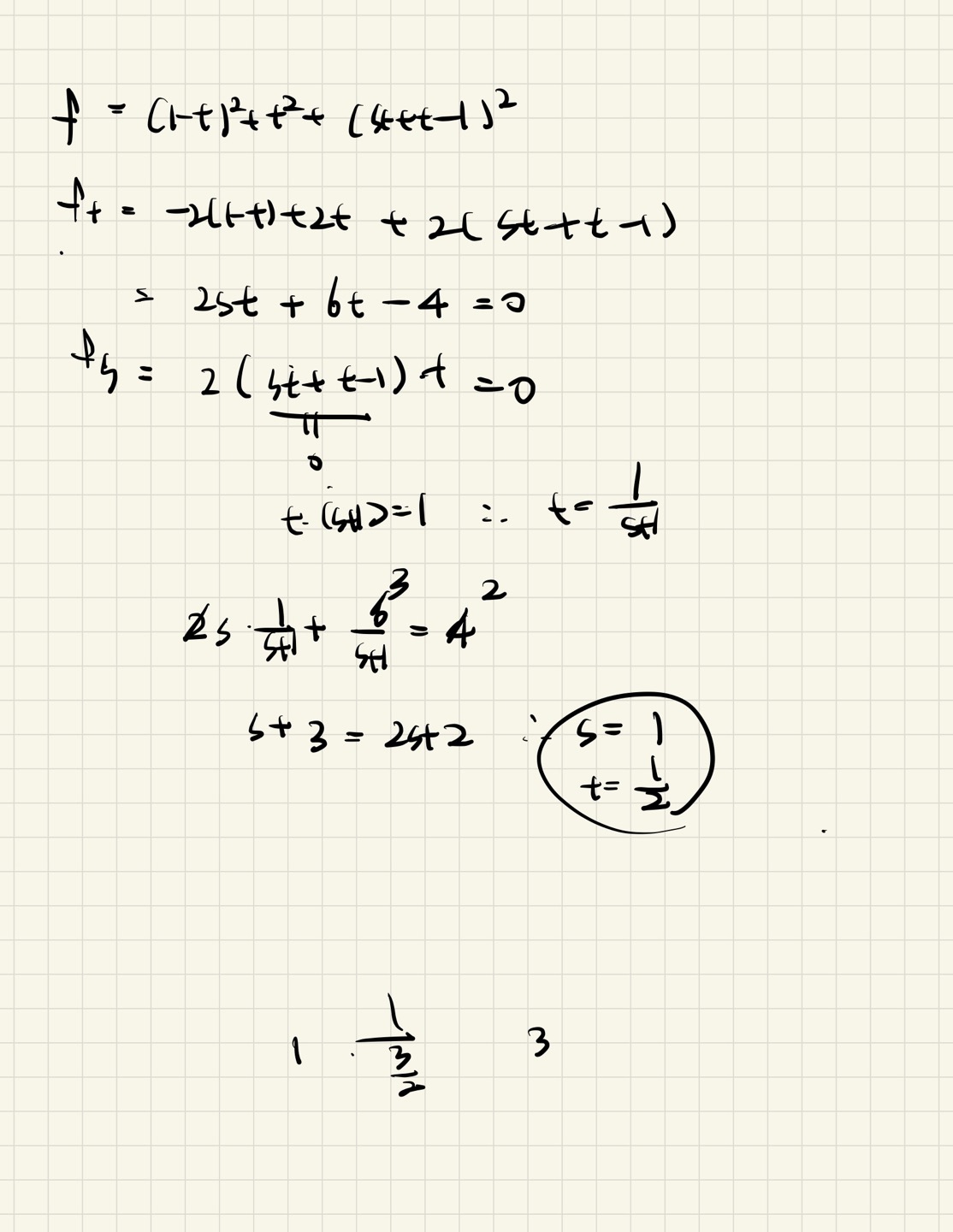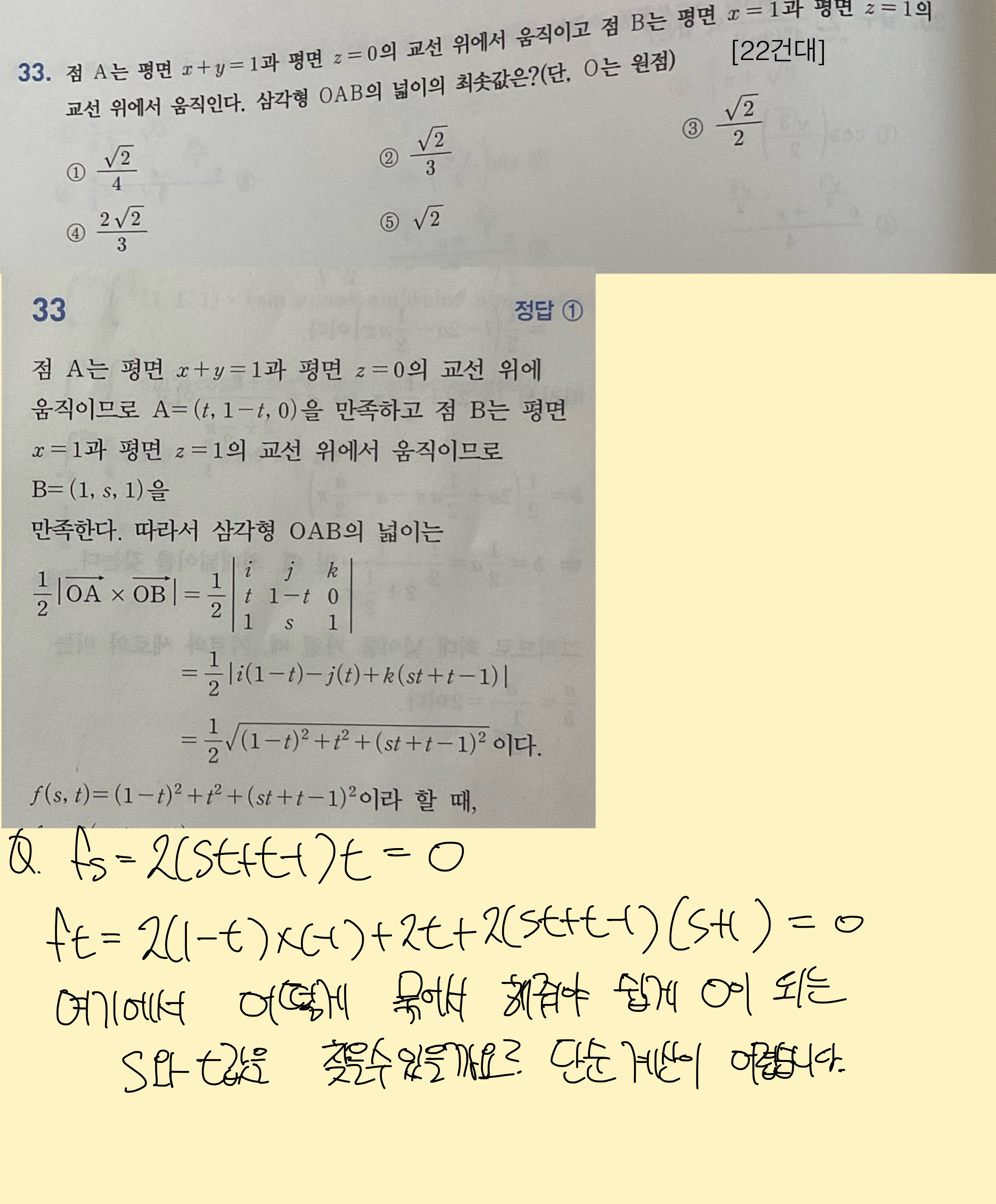 s값과 t값을 바로 구할 수가 없어서 그냥 아쉽게 하다 찍은 문제입니다.. s값과 t값을 구하기 위해서 좀 식을 간결하게 정리해서 구해줘야 되는데 그게 어려워서 질문드렸습니다. 어떻게 정리해줘야 쉽게 풀 수 있을까요? |