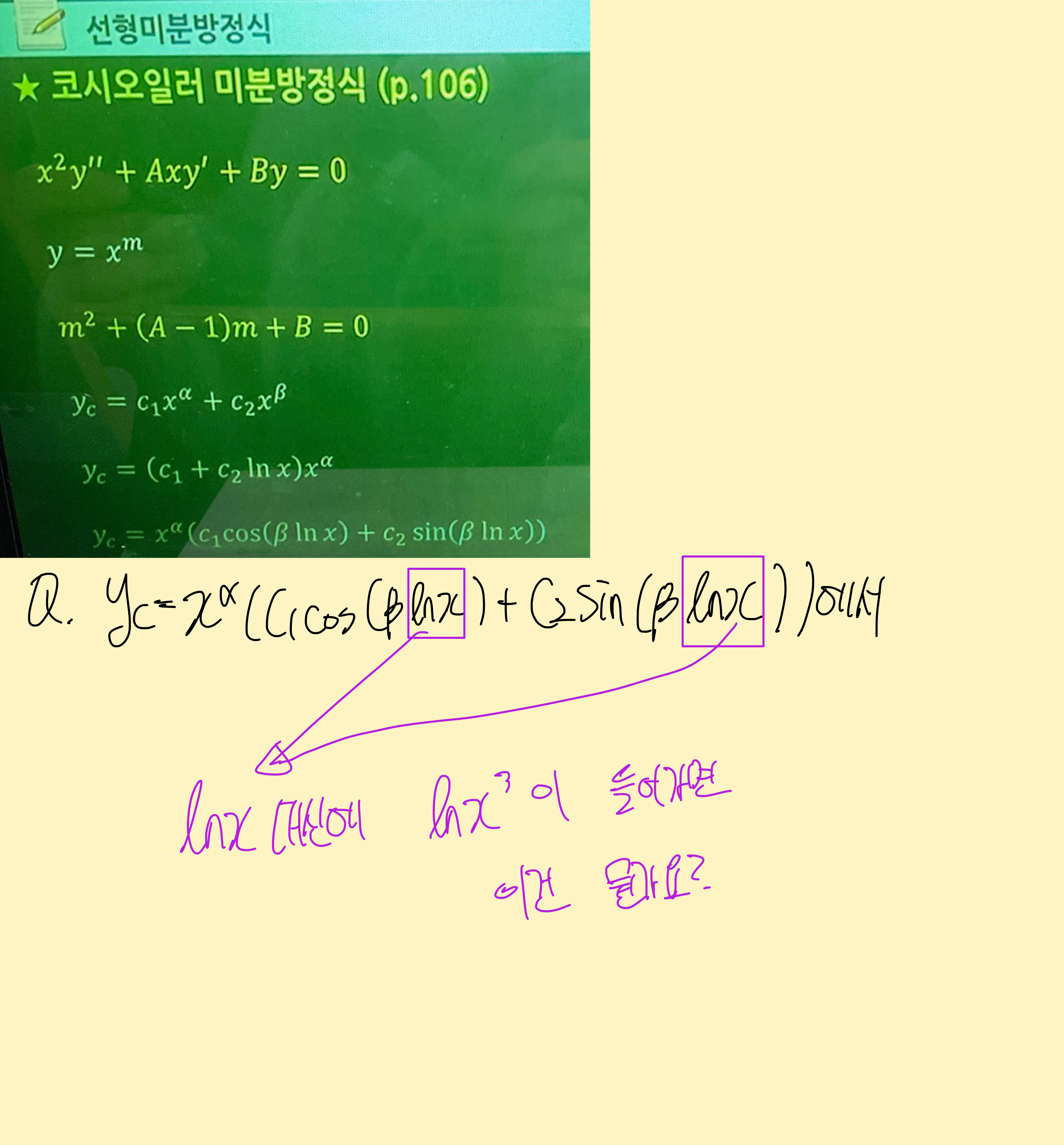코시오일러가 e^z=x , z=lnx 치환이죠. 과정이 들어가죠.