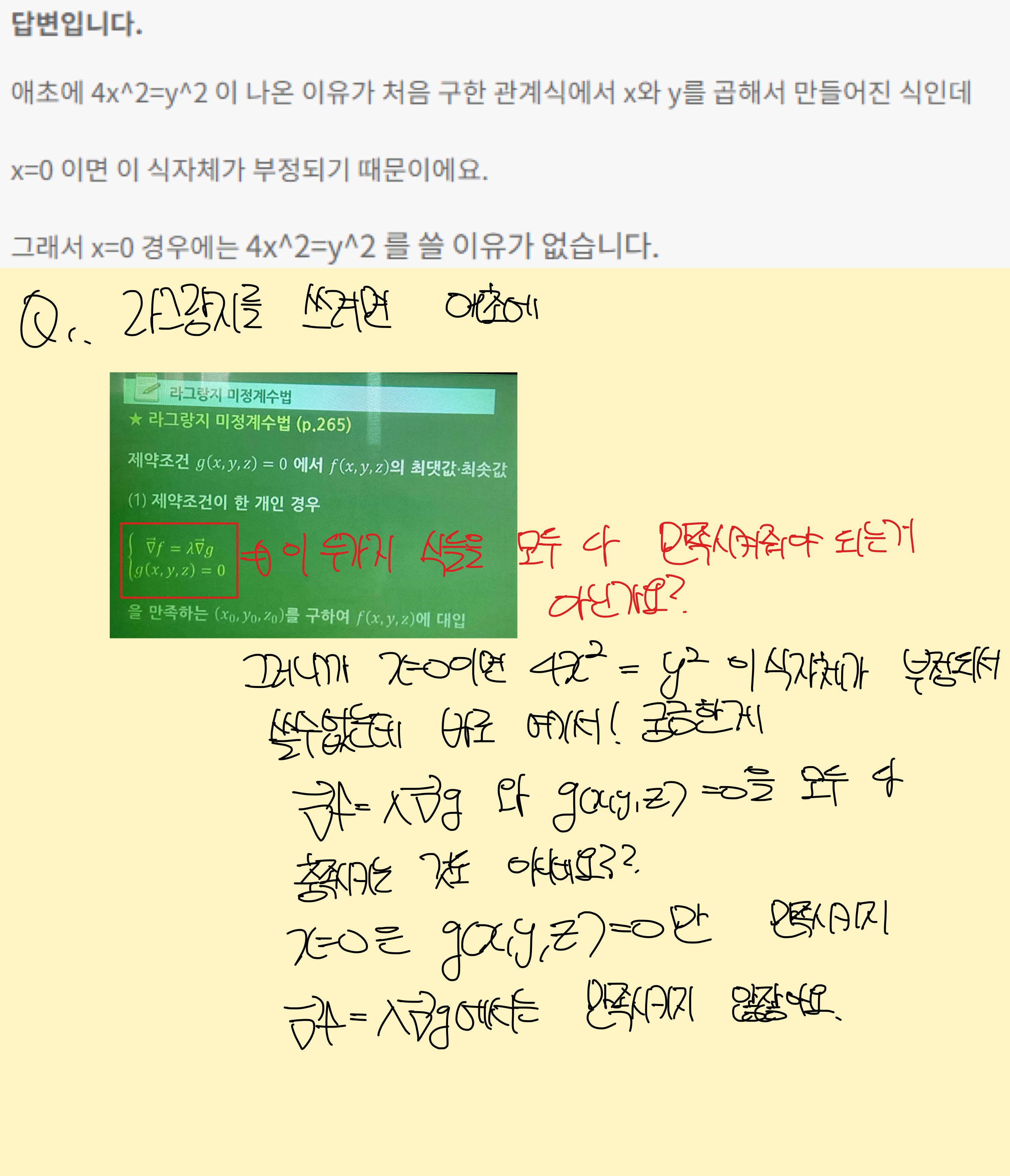 라그랑지를 쓸 때 저 두식을 다 만족시키는 x값y값z값을 구하는 것인데 저 19아주대 45번문제의 경우에는 x=0이면 당연히 그라디언트f=람다*그라디언트g의 식을 부정하는건데 그러면 애초에 라그랑지를 쓸 때 그라디언트f=람다*그라디언트g 와 제약조건g(x,y,z)=0 이 두 식을 무조건 다 만족시키는 건 아닌건가요? 당연히 저는 이때까지 라그랑지를 풀 때 저 두 식에 무조건 아다리가 맞아야 그 값을 f의 x,y,z에 대입해서 최댓값 또는 최솟값을 구해왔는데 저 문제는 라그랑지를 쓸 때 두 식이 충족하는 값을 구해서 집어넣은게 아니라 그라디언트f=람다*그라디언트g 와 제약조건g(x,y,z)=0 두 식 중 하나만 만족시켜서 f의 x,y,z에 대입해서 값을 구해서 헷갈립니다. |