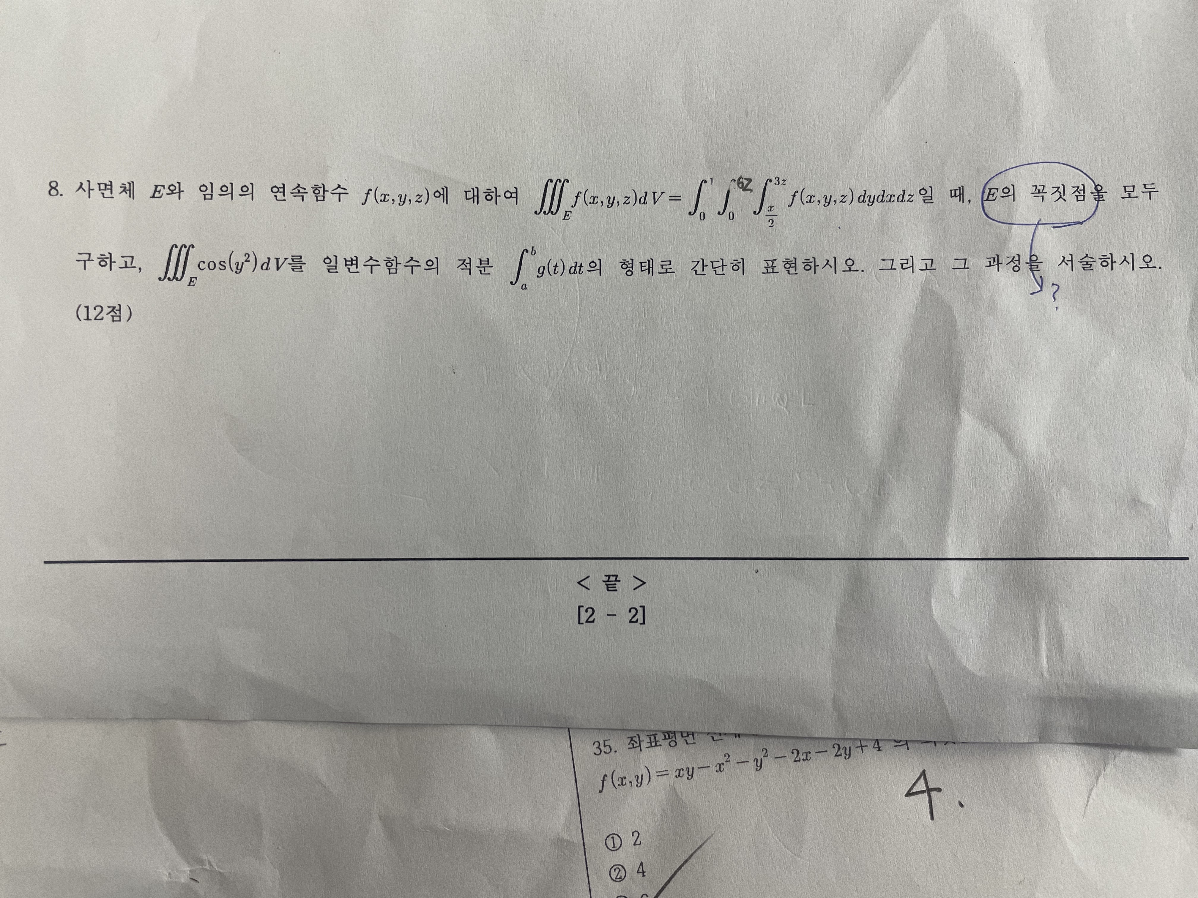 이 문제에서 cos(y^2)에 대해서 변수 범위를 바꿔서 푸는것은 알겠는데 E의 꼭짓점을 구하라는 말이 어떤 말인지 잘 이해가 가지 않습니다! 어떻게 푸는 건가요?