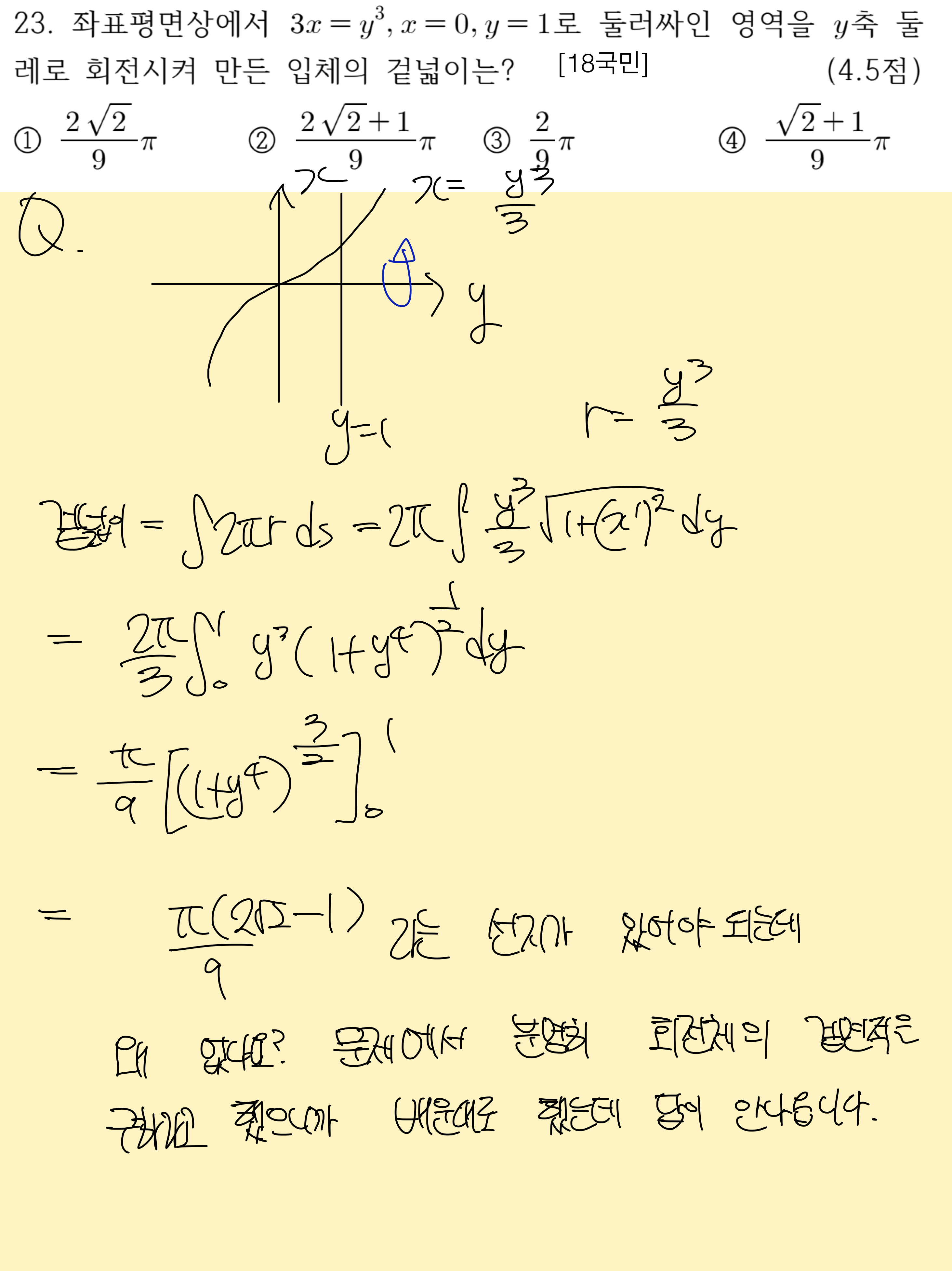 풀이과정을 다시 음미해봐도 맞고 문제에서도 회전체의 겉면적을 구하라고 했으니까 저렇게 구해야 되는게 맞지 않나요? 근데 왜 답이 안나올까요 교수님..