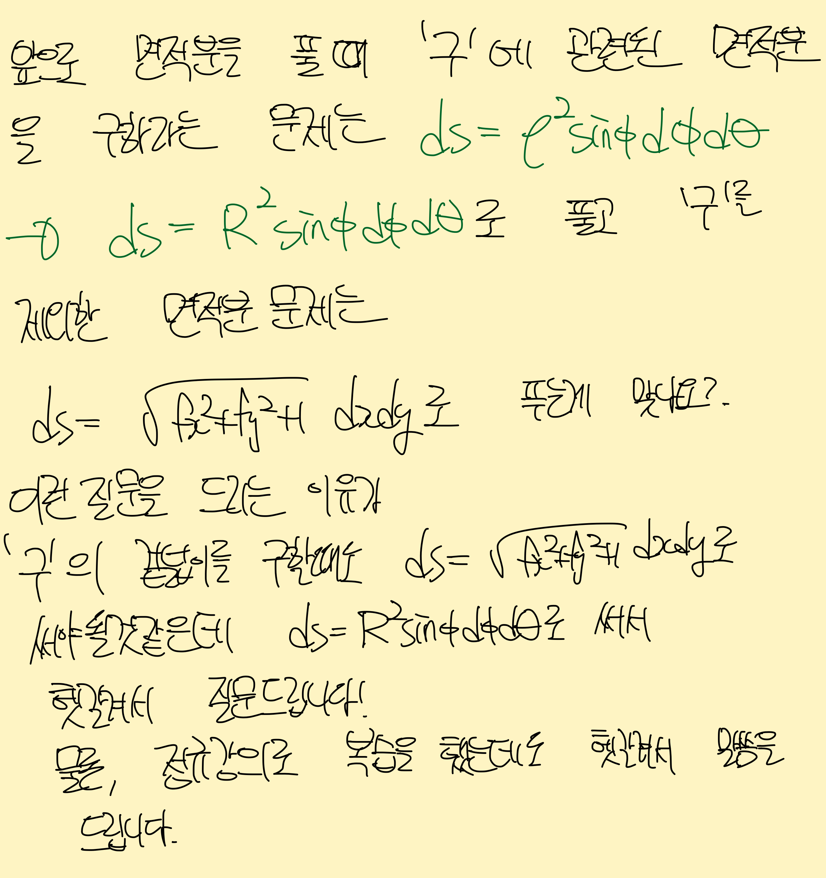 3. 구의 겉면적 구의 겉면적구할 땐 루트(1+fx^2+fy^2)를 쓰지 않습니다! 직교(x,y,z)나 주면좌표계(r,세타,z)인 경우만 루트(1+fx^2+fy^2) 입니다. |