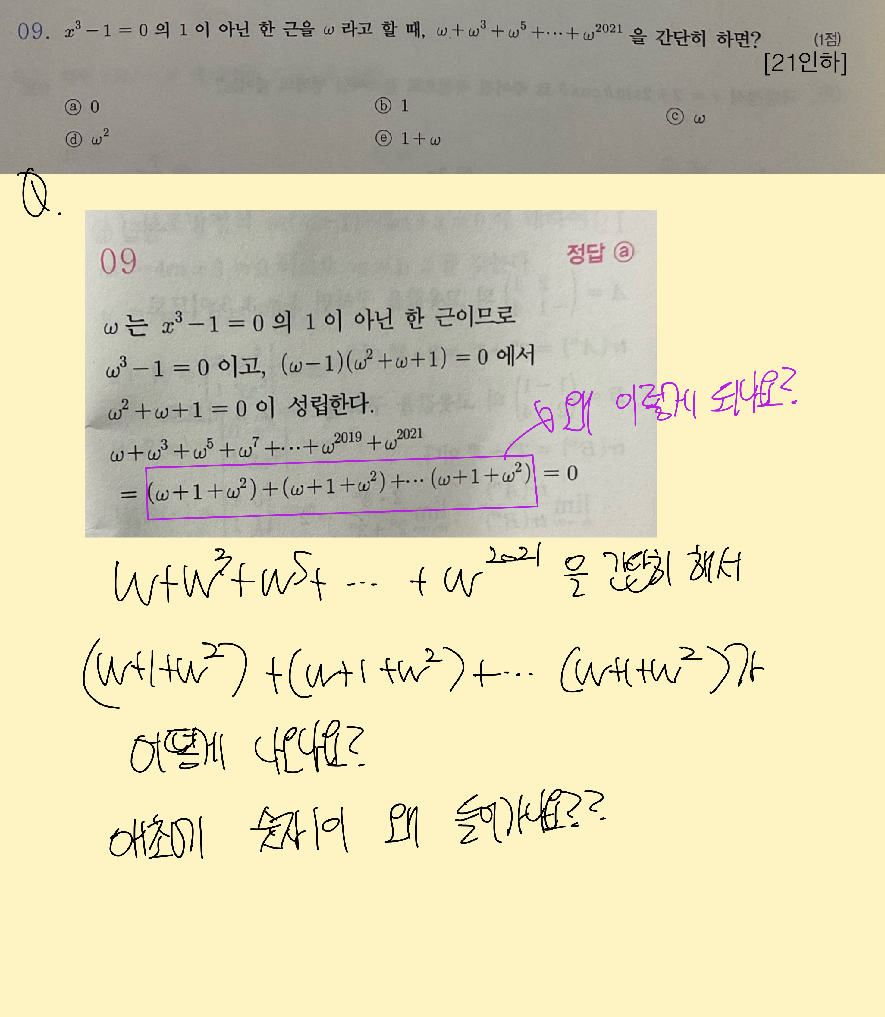 w+w^3+w^5 = w+w^3(1+w^2) 후 w^3=1 이고 을 집어넣으면 w+1+w^2 이 됩니다.