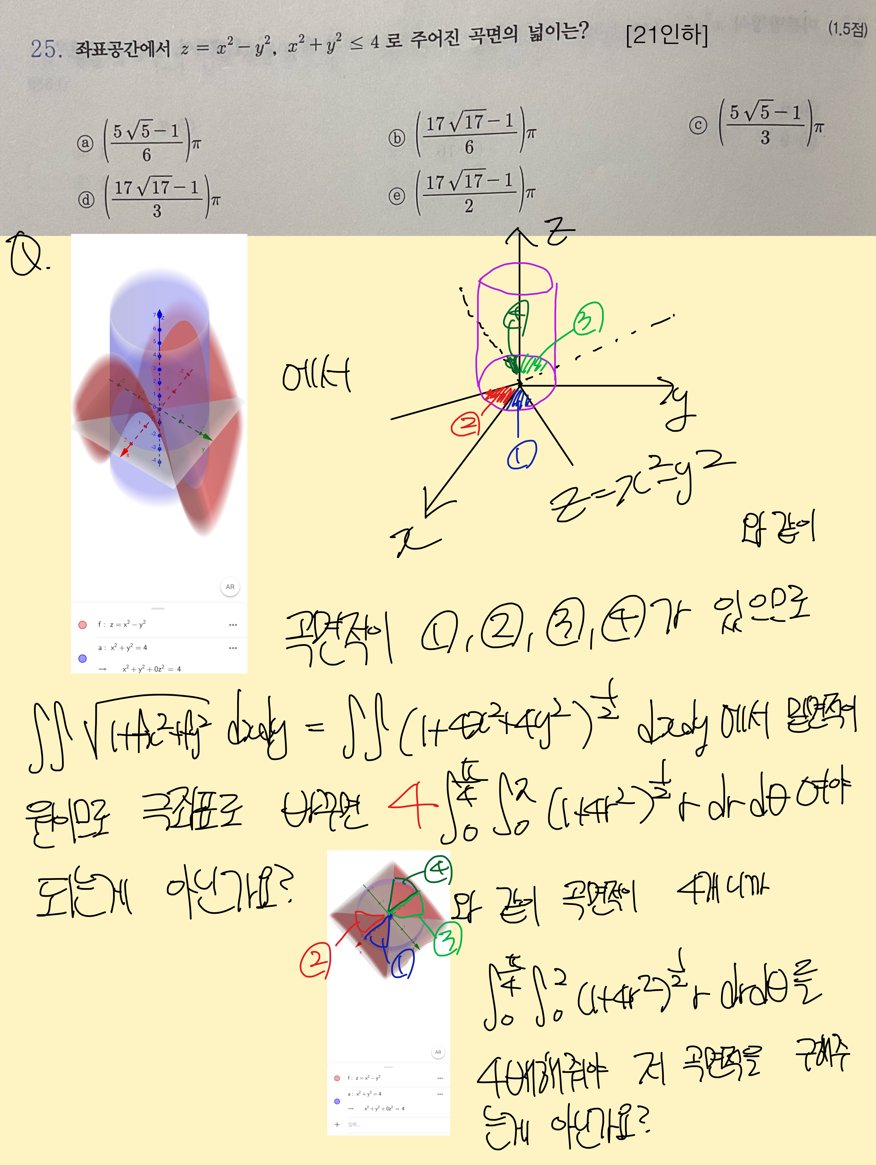 지금 그래프 z=x^2-y^2 을 보면 360도 다 그려집니다. 1234 외에 부분도 면적이 있습니다.