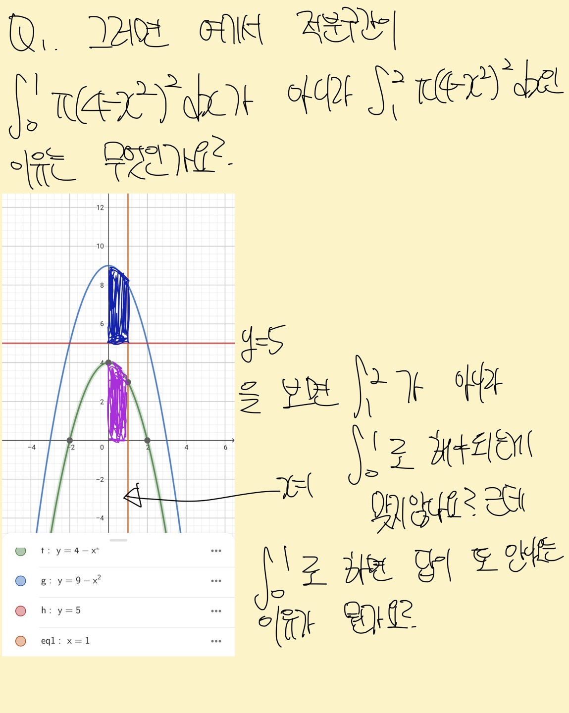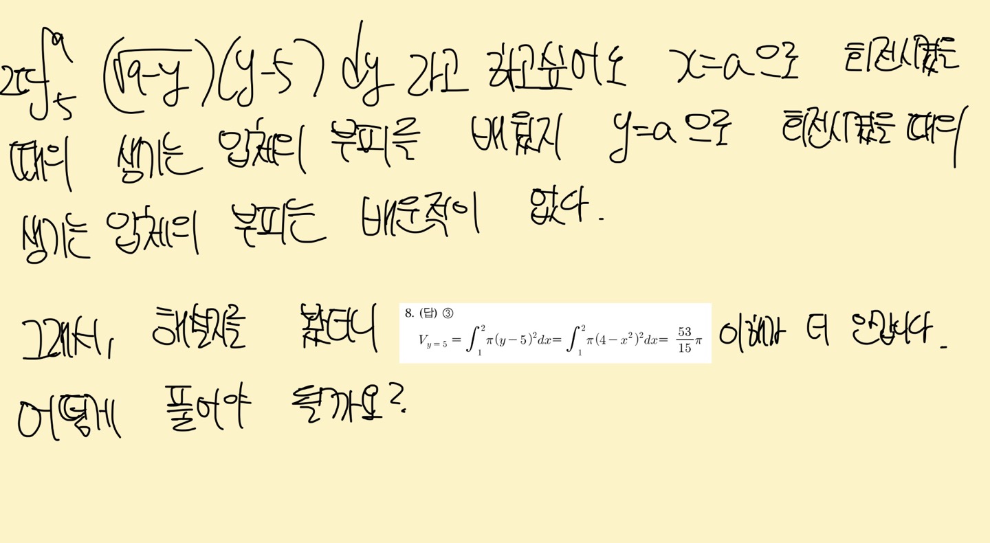 식이 (y-5)^2pi가 나온건 어떻게 이해하겠다고쳐도 적분구간이 0~1이 아니라 1~2가 나온 이유가 무엇인가요? 왜 이렇게 되는지 모르겠습니다.