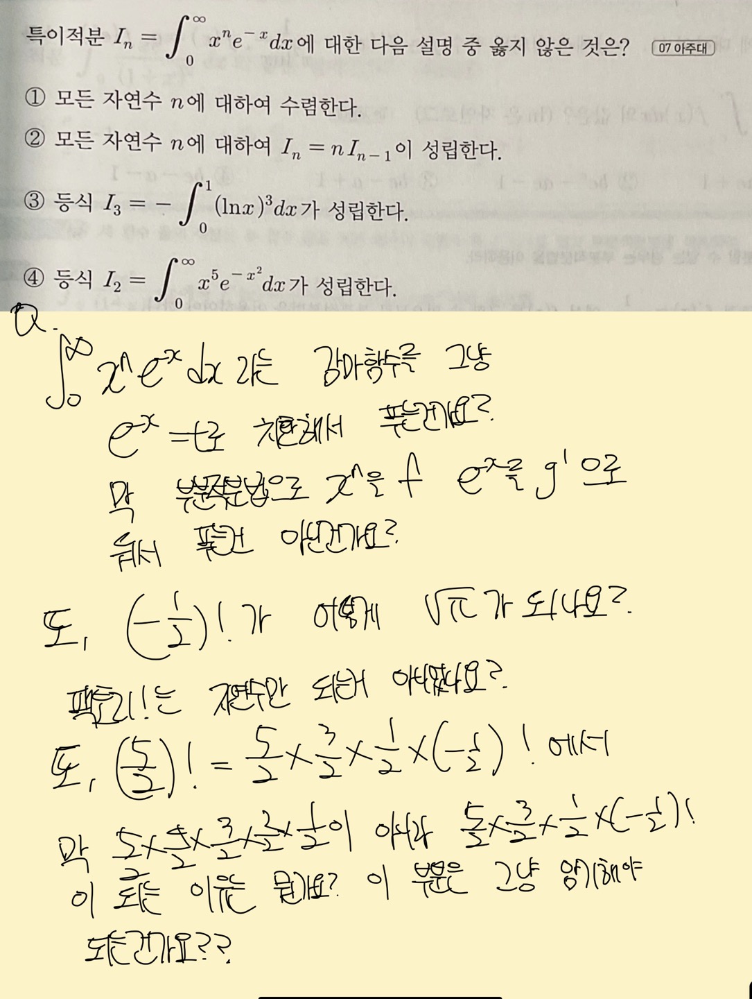 (-1/2)! 도 감마함수 유도과정 중에 만들어지는데 실전에서 이걸 푸는 건 적합하지 않습니다.