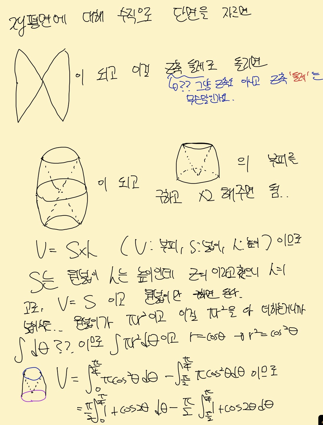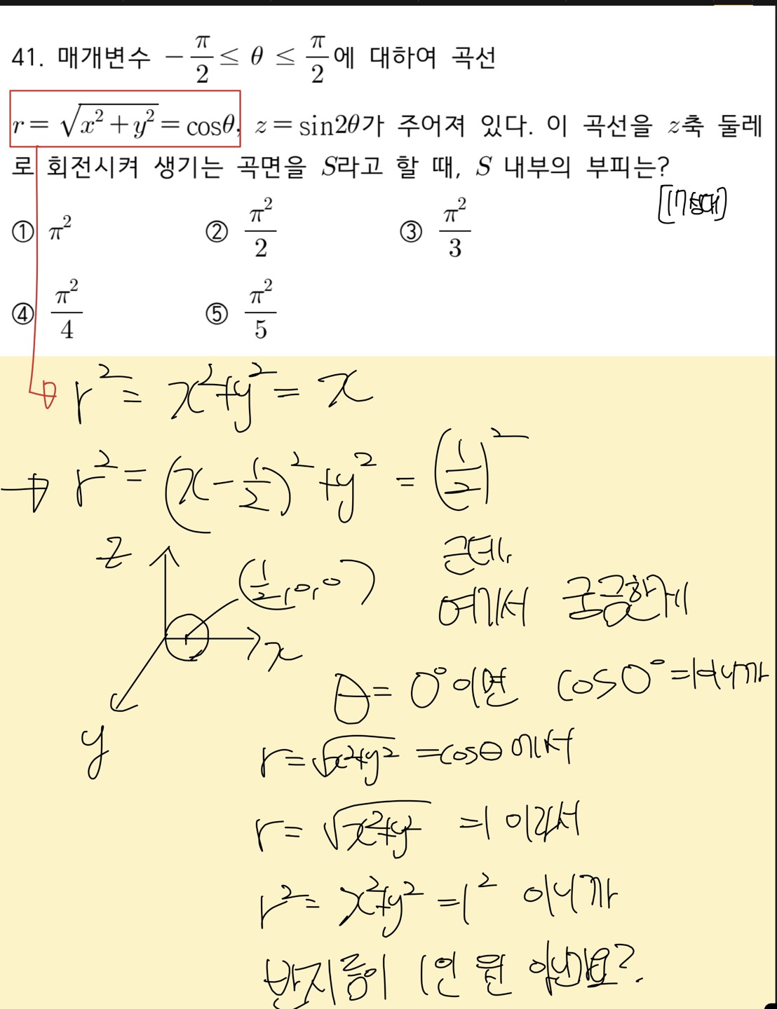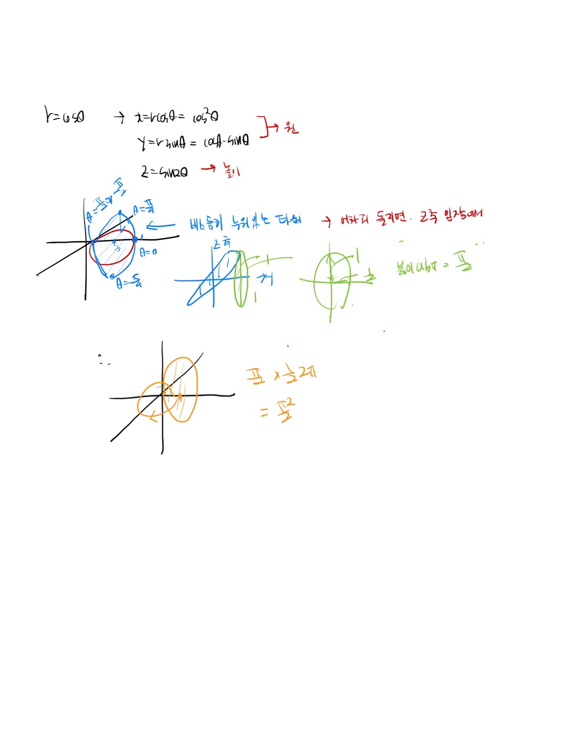 정확히는 1번 원넓이식에서 d세타를 창조해준건데.. 수업에서 여러가지의 적분식 인테그랄ydx부터 시작해서 인테그랄파이y^2dx등등이 있지만 가장 예를 들기 쉽게 인테그랄ydx가 넓이를 다 더한 식인데 이것도 처음에 그림그려서 ydx가 하나의 넓이이고 이거를 다 더하고 싶으니까 이 ydx라는 식에다가 인테그랄을 붙인게 다고 여기에서 dx가 있으니까 적분구간을 이 dx에 맞춰서 x=a, x=b까지 이렇게 해서 넓이를 구할 수가 있었는데 여기서 말하고 싶은 바는 ydx라는 넓이 식에서 인테그랄을 씌운거잖아요. dx를 창조해낸 것이 아니라. 근데, 제가 풀이한 1번 원넓이식에서 원넓이식 파이*반지름^2에서 z축을 제거한 식인 파이*코사인제곱세타를 만들어서 여기에서 다 더하고 싶으니까 인테그랄을 씌웠는데 여기서 d세타가 없더라구요.. 그래서 d세타를 그냥 창조해줬는데 "알아서" 이렇게 써서 푼 것이 아니라 애매모호하게 해서 푼 거라서 잘 모르겠습니다. 특히 이 부분이..