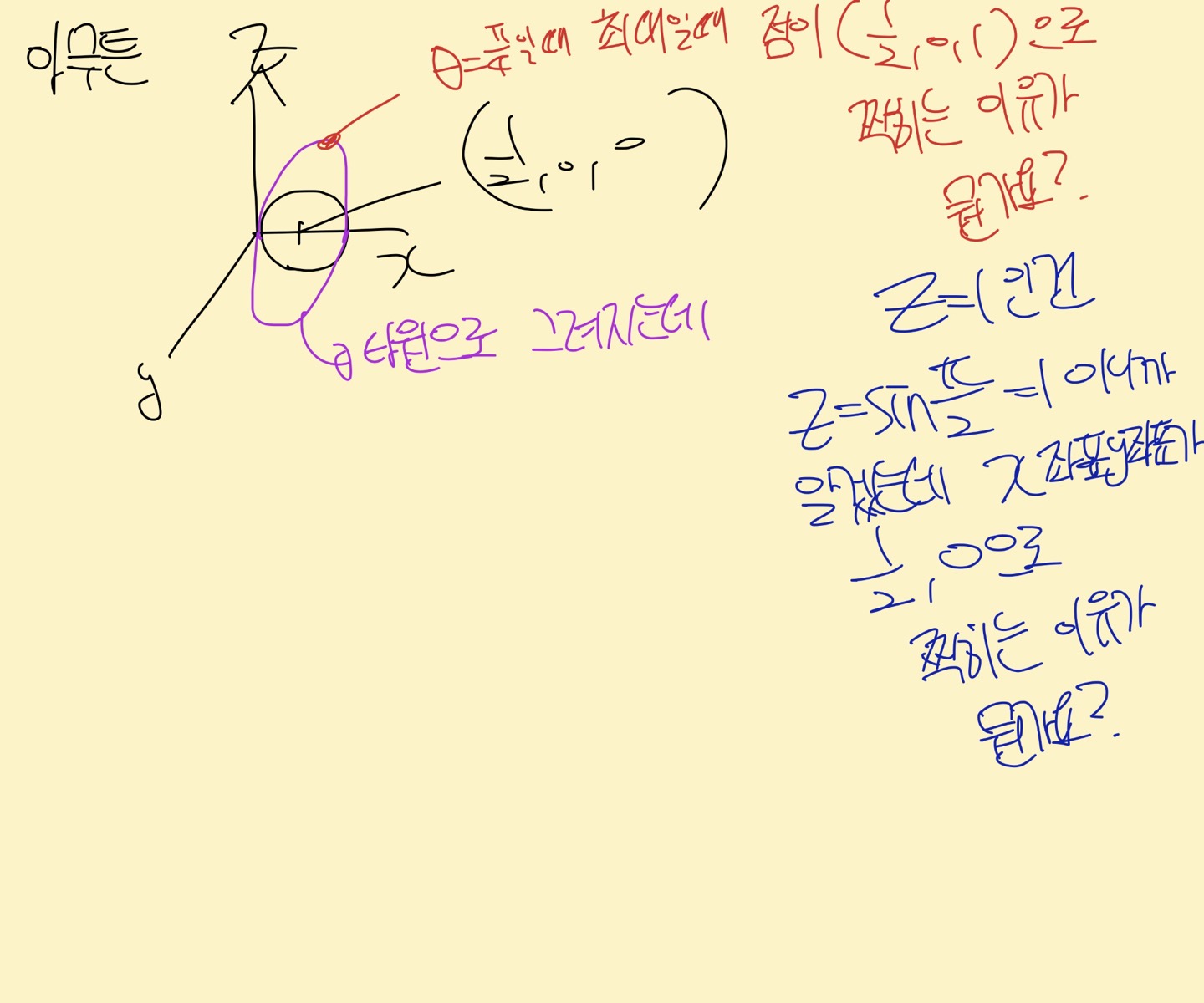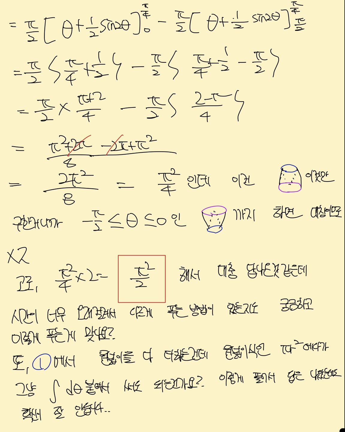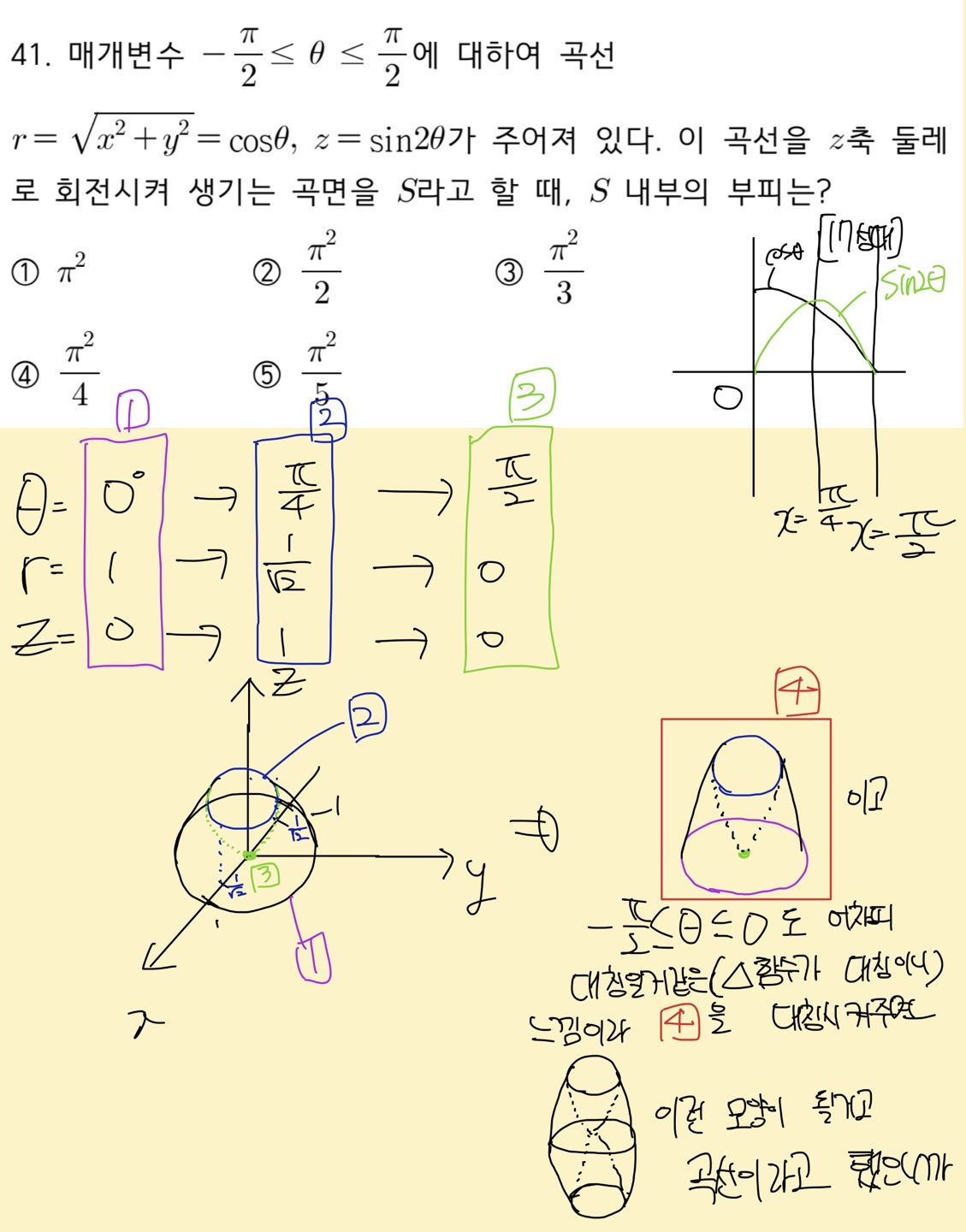 정확히는 1번 원넓이식에서 d세타를 창조해준건데.. 수업에서 여러가지의 적분식 인테그랄ydx부터 시작해서 인테그랄파이y^2dx등등이 있지만 가장 예를 들기 쉽게 인테그랄ydx가 넓이를 다 더한 식인데 이것도 처음에 그림그려서 ydx가 하나의 넓이이고 이거를 다 더하고 싶으니까 이 ydx라는 식에다가 인테그랄을 붙인게 다고 여기에서 dx가 있으니까 적분구간을 이 dx에 맞춰서 x=a, x=b까지 이렇게 해서 넓이를 구할 수가 있었는데 여기서 말하고 싶은 바는 ydx라는 넓이 식에서 인테그랄을 씌운거잖아요. dx를 창조해낸 것이 아니라. 근데, 제가 풀이한 1번 원넓이식에서 원넓이식 파이*반지름^2에서 z축을 제거한 식인 파이*코사인제곱세타를 만들어서 여기에서 다 더하고 싶으니까 인테그랄을 씌웠는데 여기서 d세타가 없더라구요.. 그래서 d세타를 그냥 창조해줬는데 "알아서" 이렇게 써서 푼 것이 아니라 애매모호하게 해서 푼 거라서 잘 모르겠습니다. 특히 이 부분이..