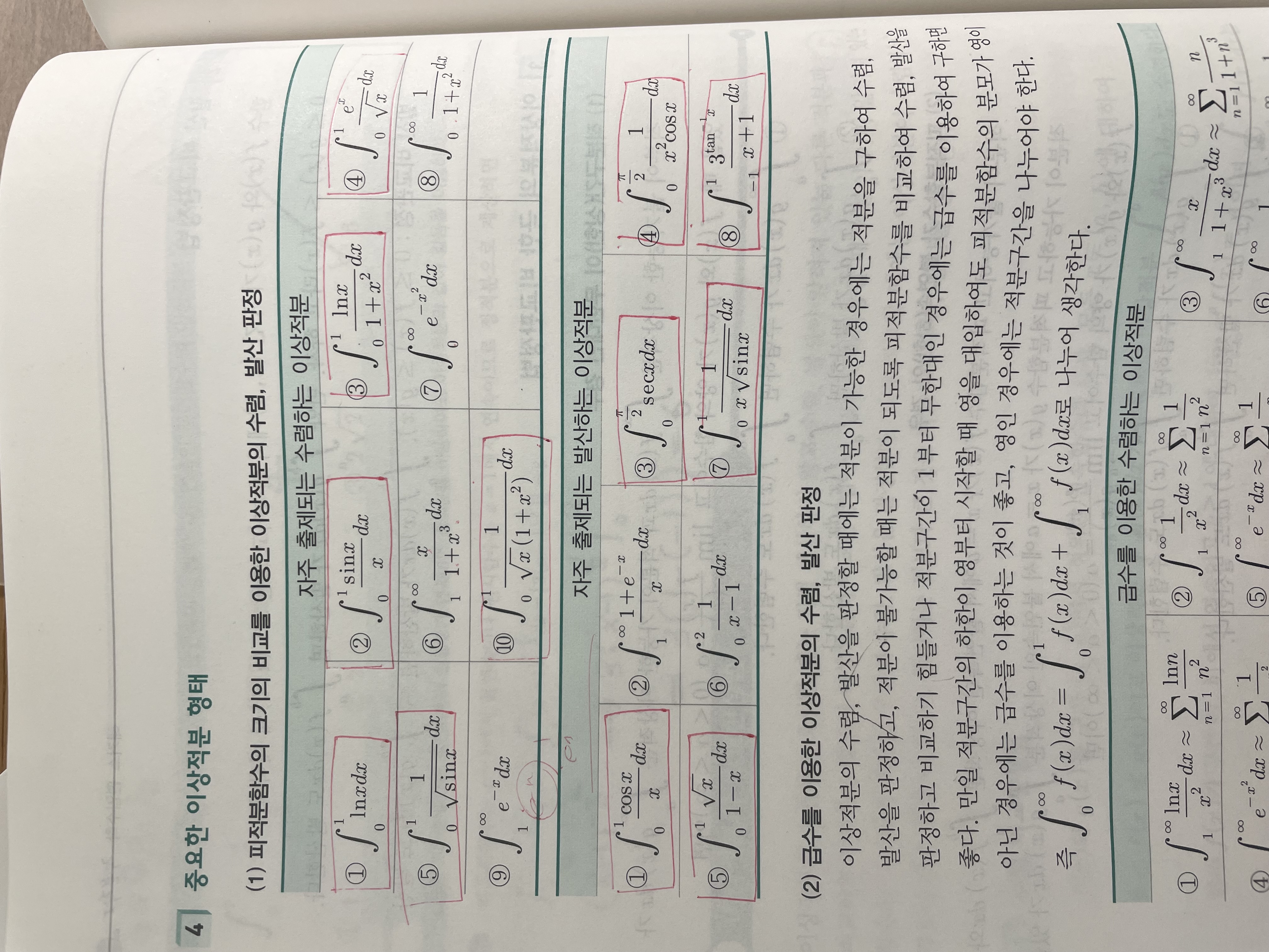 이상적분 부분은 급수 부분 파트 끝나고 다시 보라고 하셨던 것이 기억이 납니다. 제가 공부해본 결과 1부터 무한대까지 이상적분은 급수로 보고 거기서 수열의 극한처럼 다뤄서 처리하는 것으로 이해했습니다. 그런데, 사진에서 빨간색으로 표시한 부분처럼 0부터 1까지의 무한급수들은 그래프를 그리기 어려운 부분인데, 전부 암기해야 할까요? 혹시 빠르게 수렴,발산 판단 할 수 있는 방법이 있는지 궁금합니다.