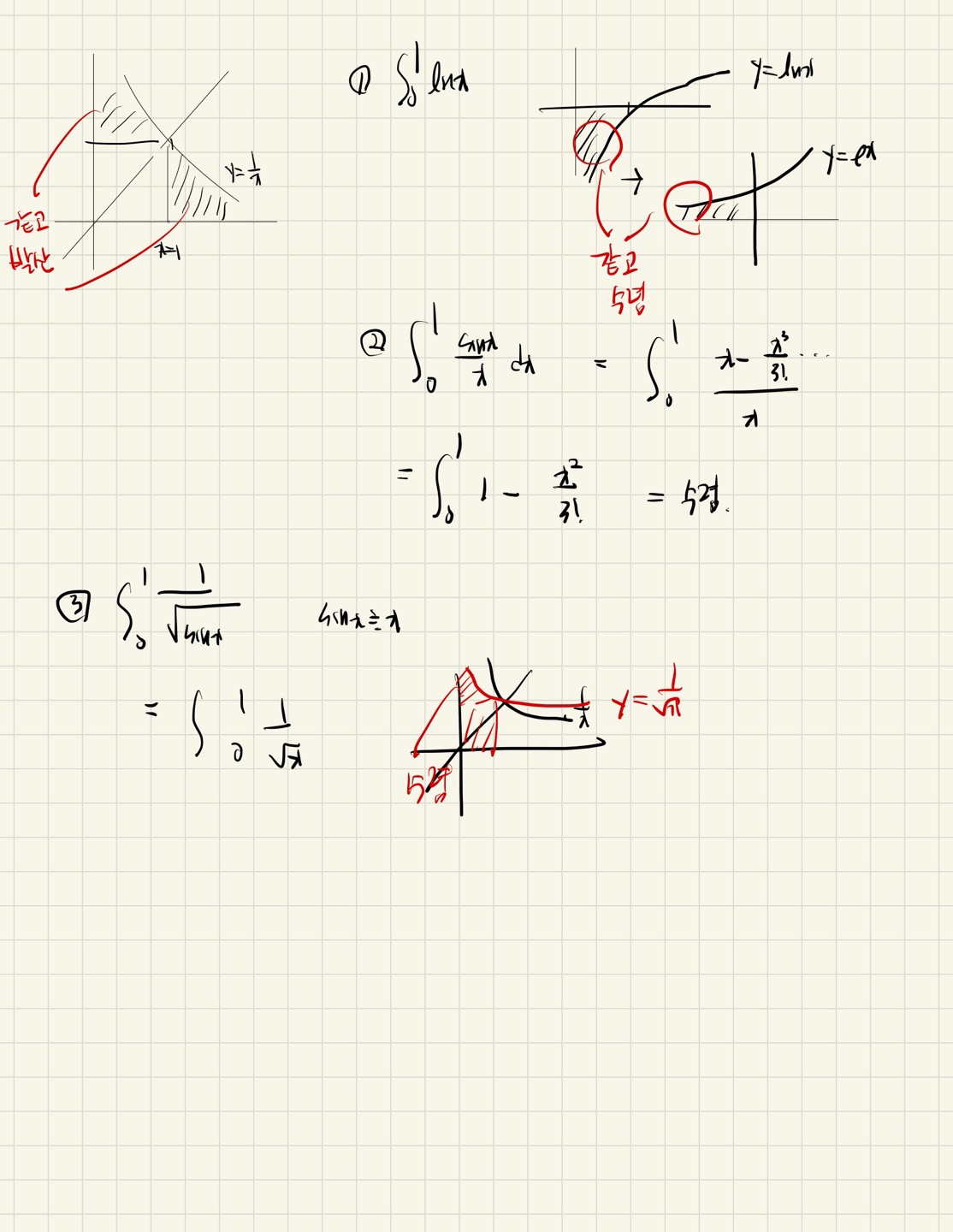 0~1사이엣 1/x 보다 납작하면 수렴입니다.