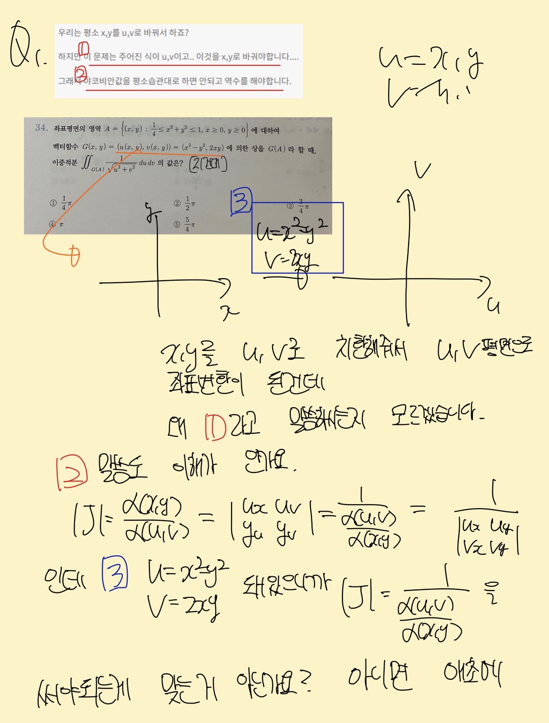 u,v로 하고 싶어도 범위가 x,y로 주어져있기 떄문에 u,v로 적분하기 힘듭니다.