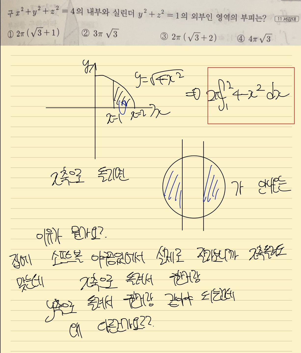 이게 y^2pi 를 써야할지 2pixy를 써야할지 고민되는 부분인데요.