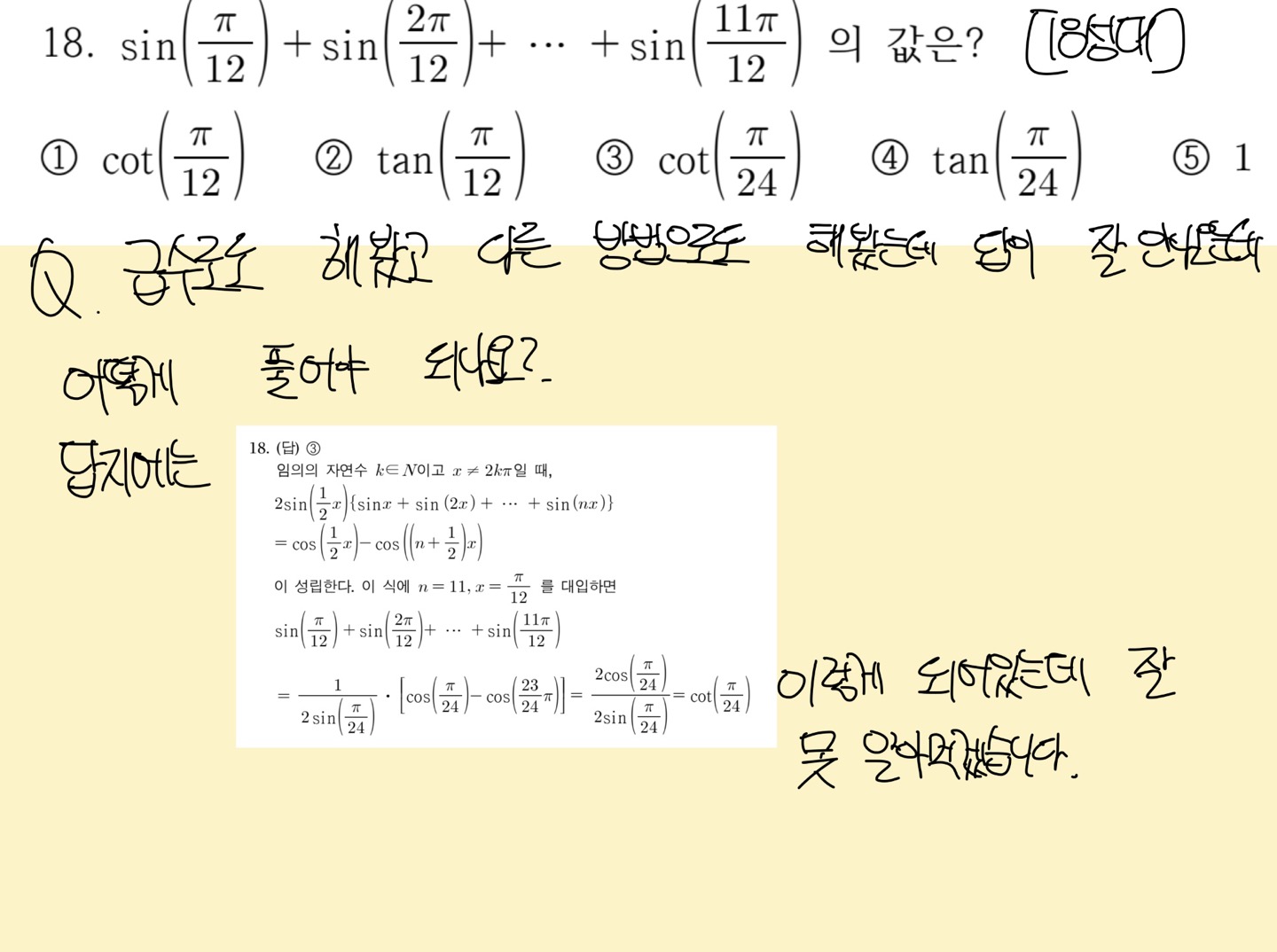 사실 1번 3번에서 찍어야하는데.. cot는 tan 역수인데 tanpi/24는 너무너무 작아서 cot가 너무너무 커지게 되거든요.