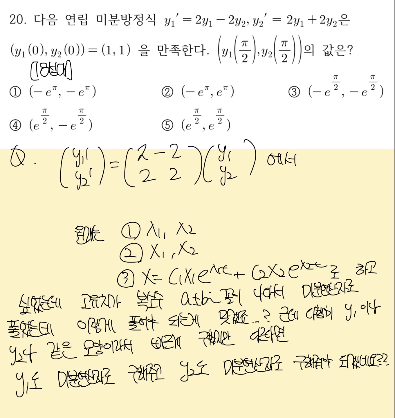 그리고 또 다른 질문 하나는.. 공수를 복습하다가 연립미방강의에서 고유치가 중근일 때 답을 구하는 문제에서 고유치가 하나니까 당연히 고유벡터도 하나라고 하셨는데 이 말이 틀린 말이 아닌가요? 고유치가 하나라고 해서 고유벡터가 여러 개가 있을 수도 있다고 분명히 선형대수학 파트에서 말씀하셨는데 제가 잘못들은 건가요 아니면 뭔가요..? |