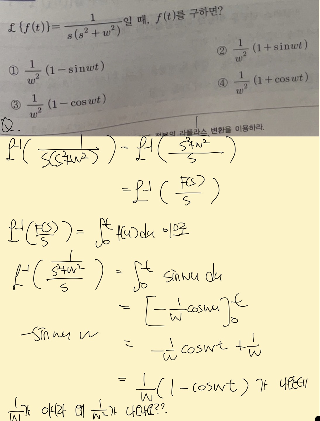 sinwt를 라플라스하면 w/(s^2+w^2)입니다. 분자의 w가 없는 1/(s^2+w^2) 로 계산해서 그렇습니다. |