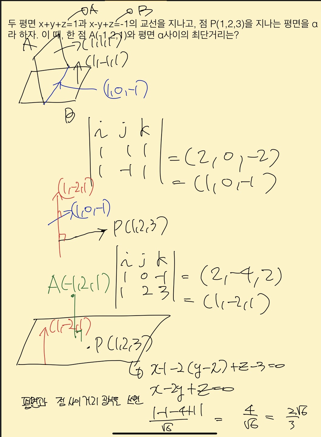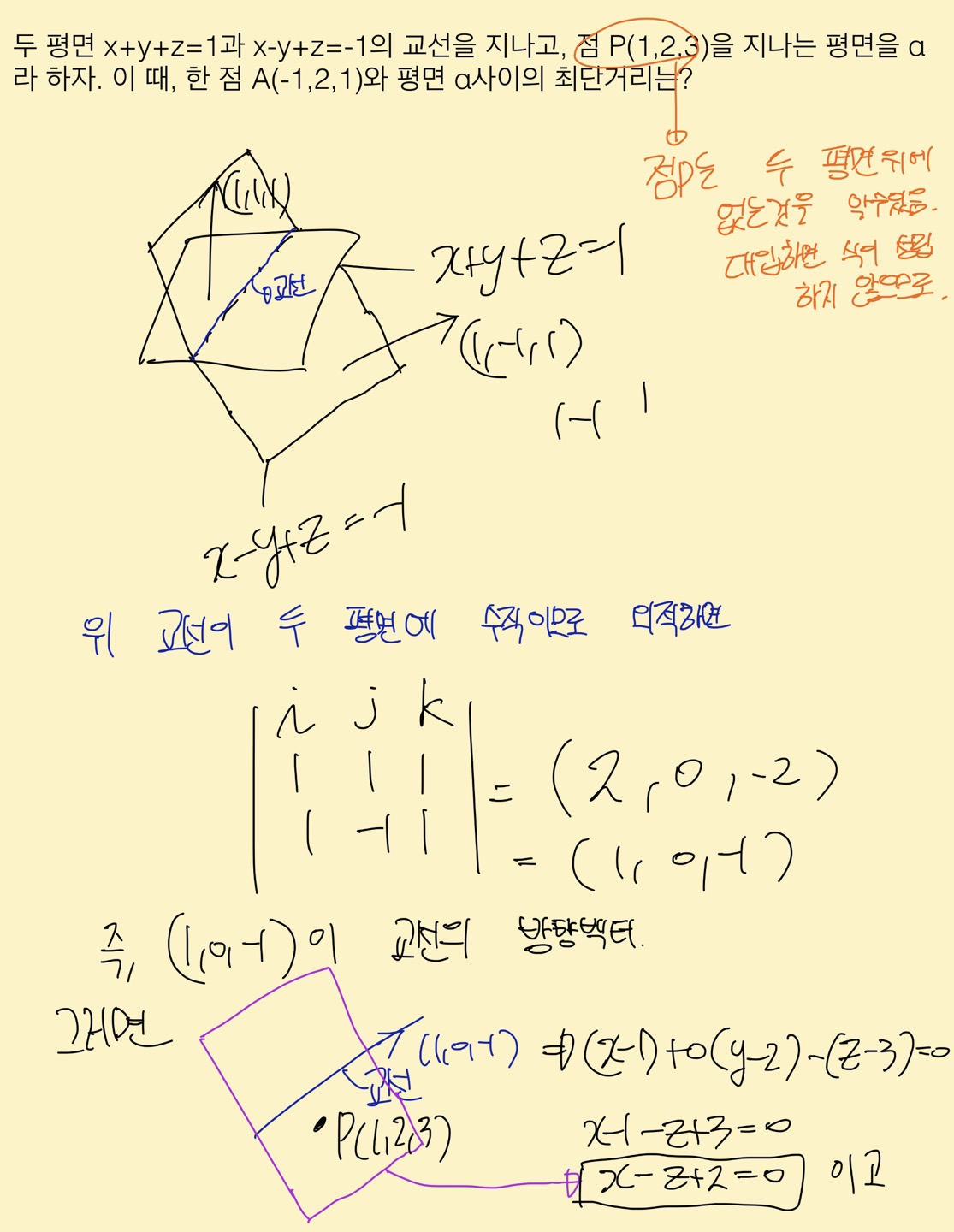 1. 두 평면의 외적으로 교선벡터를 구했죠? 그리고 교선가 포함된 평면을 구해야하는데,