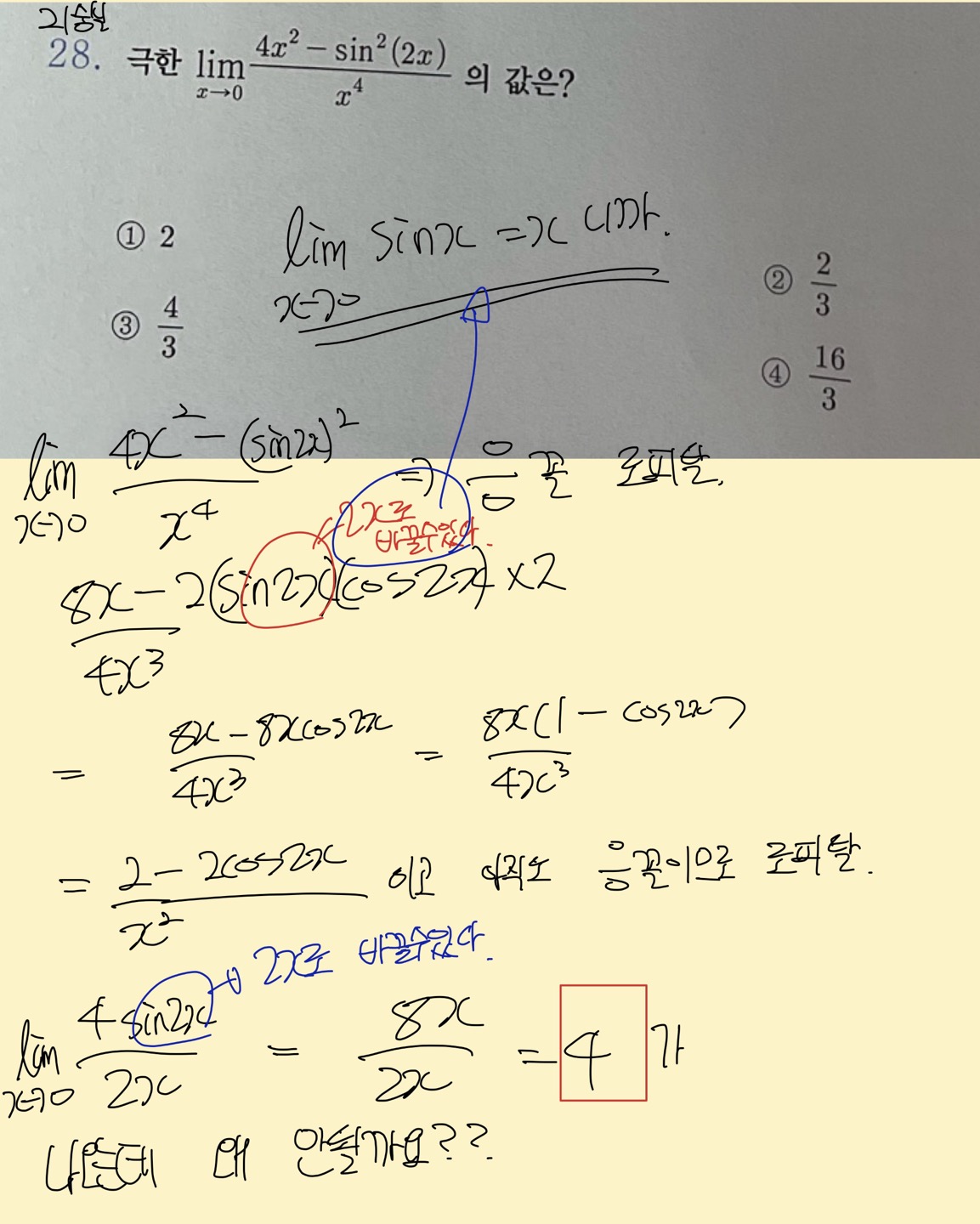 교수님 해설지에서는 무한급수로 풀었지만 제가 교수님 정규커리큘럼에서 배운 것과 같이 굳이 무한급수를 안풀고 로피탈로 이용해서 충분히 풀 수가 있었습니다. 굳이 어렵게 (사인(2x))^2를 무한급수형태로 바꿔서 미분할 필요가 없고 0/0꼴이기에 로피탈로 써서 풀어야 겠다는 생각으로 접근했는데 막상 푸니까 정답이 안나오더라구요 제가 이 계산과정 속에서 무엇을 잘못했을까요? |