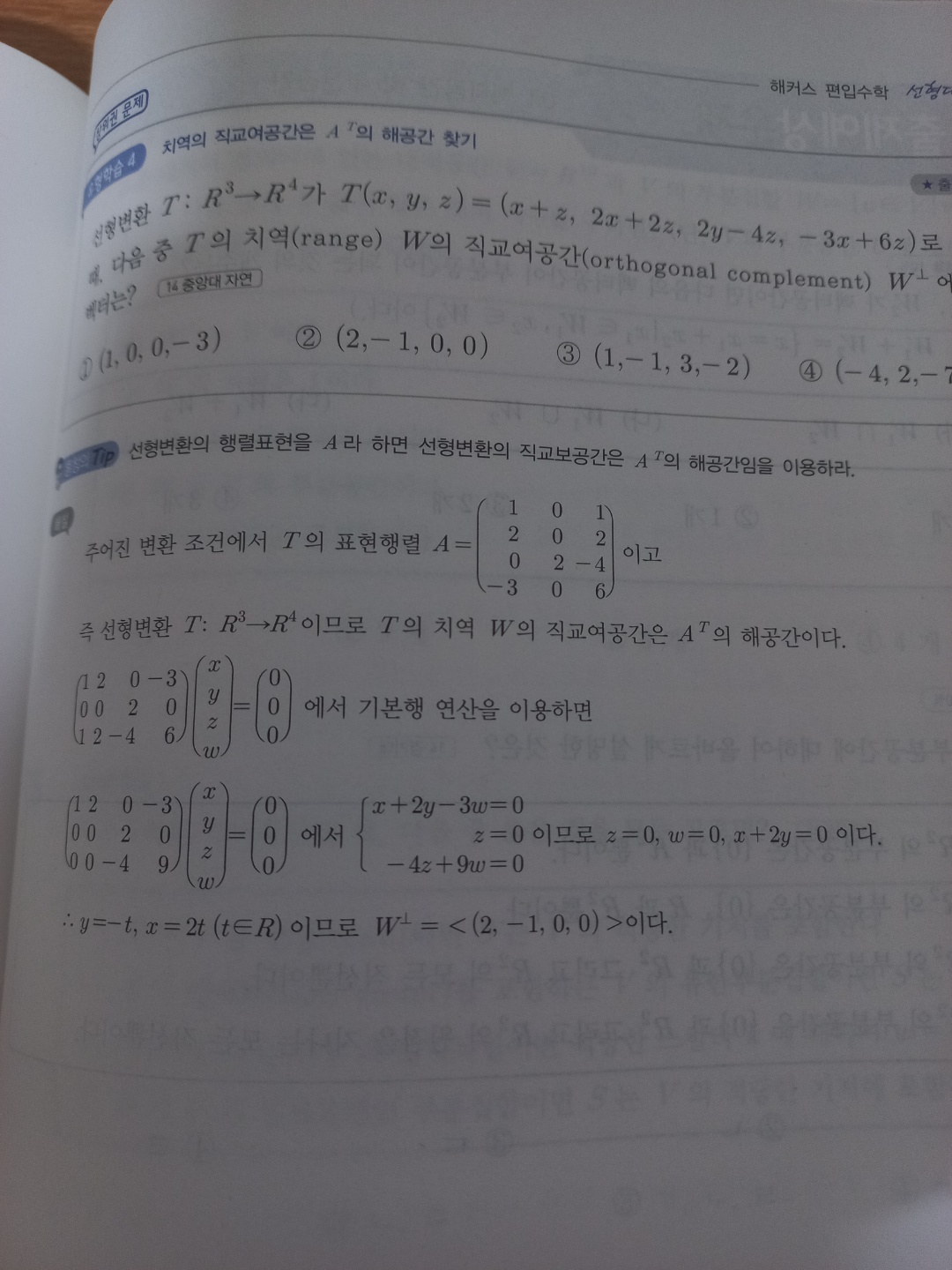 그냥 단순히 영공간은 표현하라 AtX=0 를 한다고 외우시는게 속편한데.. 사실 이 문제 말고는 그렇게 물어본 전례가 거의 없다시피해서 당시 이 문제는 거의다 틀렸을겁니다. |