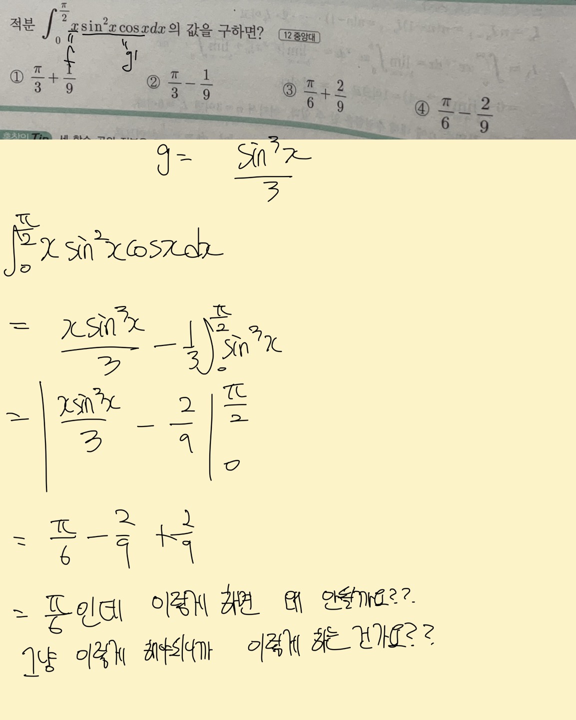 이미 왈리스 공식을 썼는데 왈리스공식을 한 값을 또 적분을 했네요. -2/9는 혼자 둬야 합니다! |