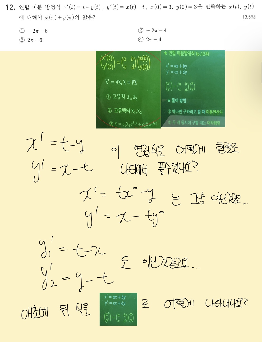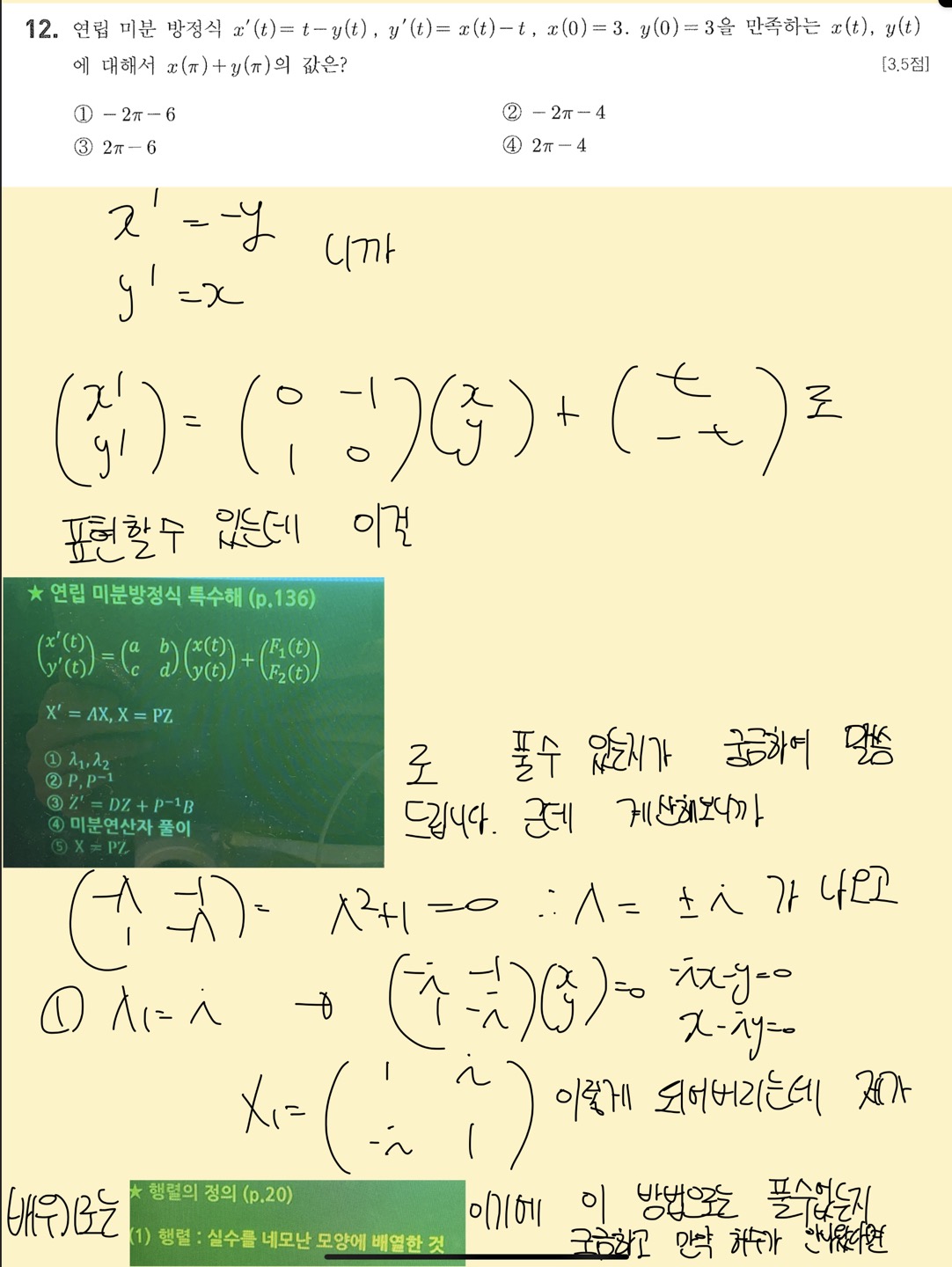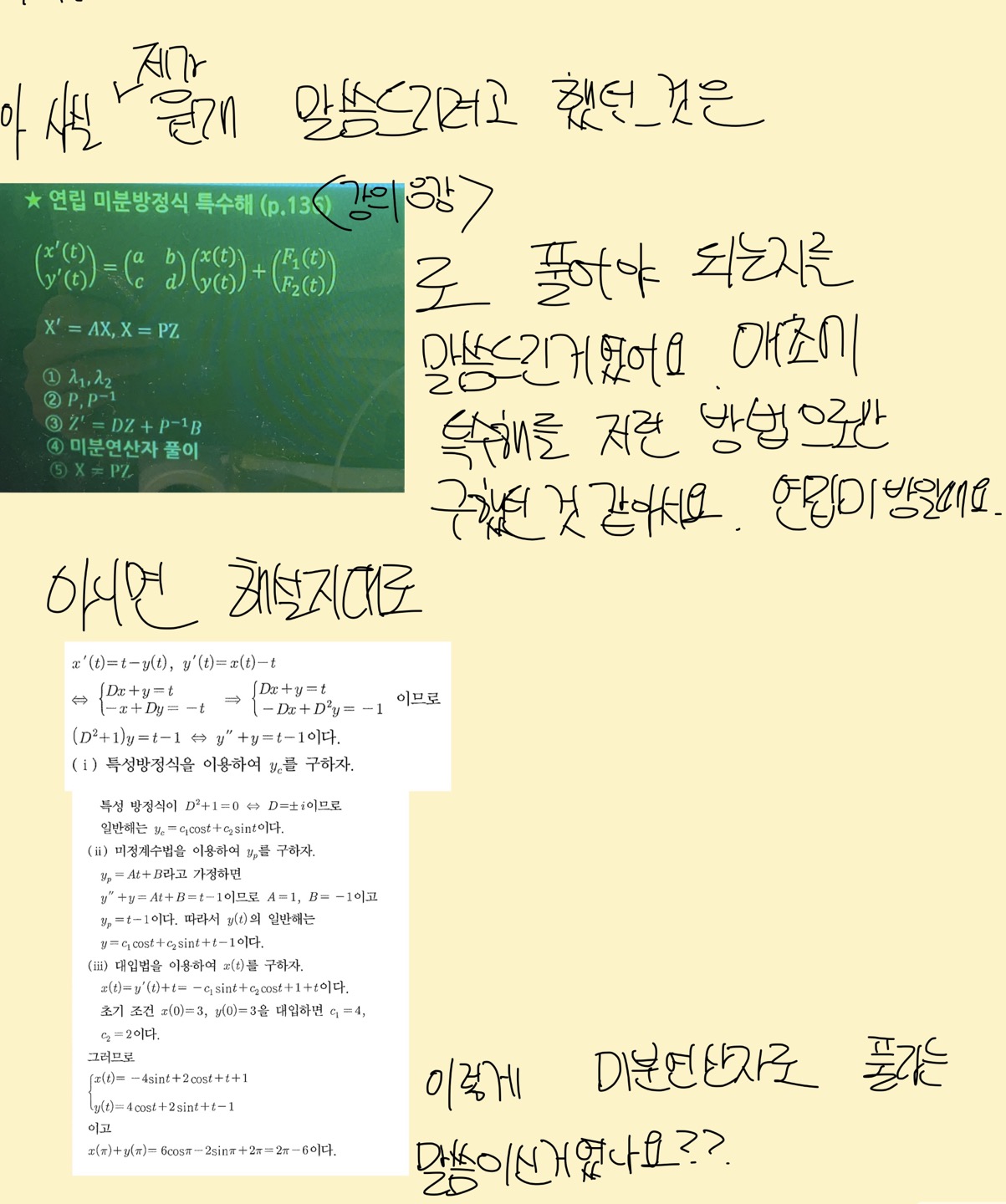안녕하세요 교수님 답변을 봤는데 이해가 안되서 염치불구하고 딱 한번만 더 재질문하겠습니다. ㅠ 다시 보니까 제가 미방식에 t가 외부조건인지 몰랐습니다. 그래서 첫 질문에서 행렬표현을 어떻게 하지라는 말이 나온 것 같습니다. 내부조건일때 인걸로 착각해서요.. 그러면 풀이방식이 수업중에 배웠던 8강에서 연립미방의 특수해를 구할 때 저렇게 구한다고 배웠습니다. 그래서 사실 제가 원래 하고싶었던 질문은 수업내용에서 배운 공식대로 저런 알고리즘으로 어떻게 푸는 지를 물어본거였는데 제가 t를 외부조건인지도 모르고 내부조건만 있을 때 행렬로 풀 수 있냐고 잘못 말씀을 드렸습니다. 어쨌든 결국, 미분연산자를 이용해서 풀라는게 1번부터 5번까지 되어있는 알고리즘 중에 4번인 미분연산자로 풀이를 말씀하시는건가요 아니면 맨 밑에 해설지 적혀있는 풀이로 문제를 풀라는 말씀이신건가요?