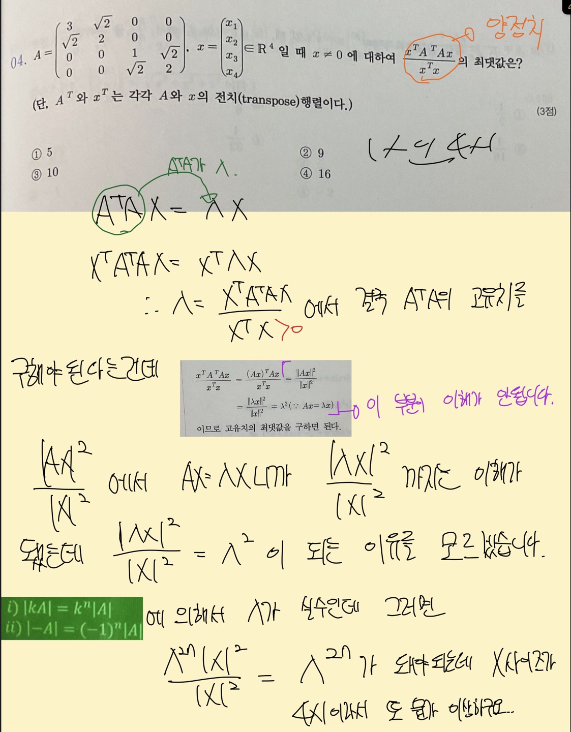 문제 생김새보고 딱 양정치를 구하는 문제라는 걸 파악했고 그러면 고유치만 구해서 그 중 최댓값인 고유치를 구하면 되겠구나하고 풀어야겠다고 생각을 했는데.. 그 옆에 A^T가 붙으니까 막상 감이 안옵니다.