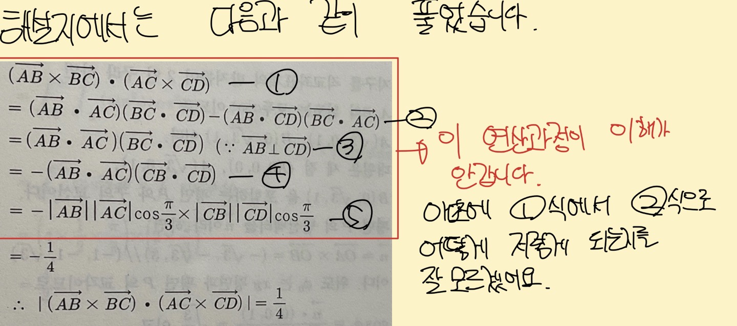 하지만 주어진 풀이에서는 교선벡터 자체를 평면의 법선벡터로 써서 값이 나오지 않았습니다.