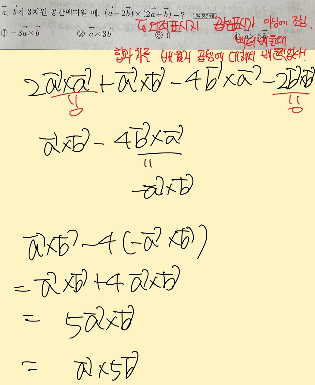 PS: 이상한 벡터 공식은 쓰지말고 a 와 b에 대입해서 풀어보록 하는게 가장 좋습니다. 어차피 벡터연산공식을 다 외우긴 불필요하고 불가능하거든요.