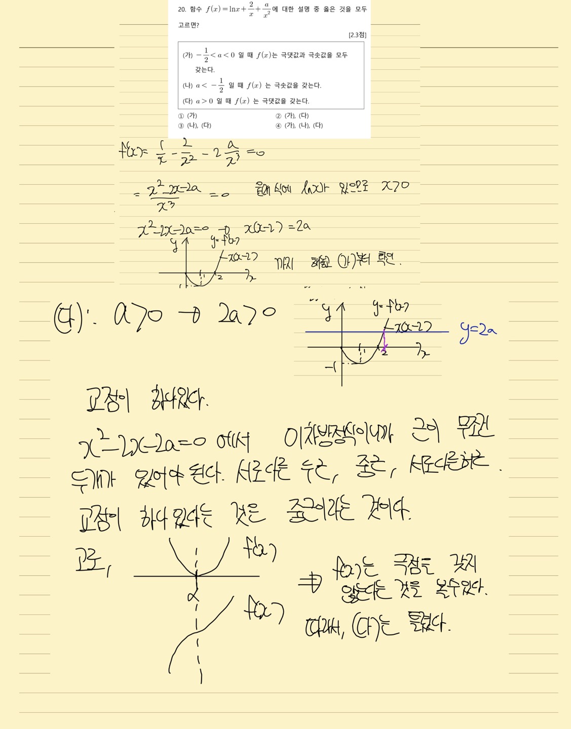 (다)보기를 저렇게 풀어서 극점이 안나온다고 풀었는데 해설지에서는 "하나의 교점을 가지며 이때 f(x)는 극솟값을 갖는다."라고 나와있어서 질문드립니다. |