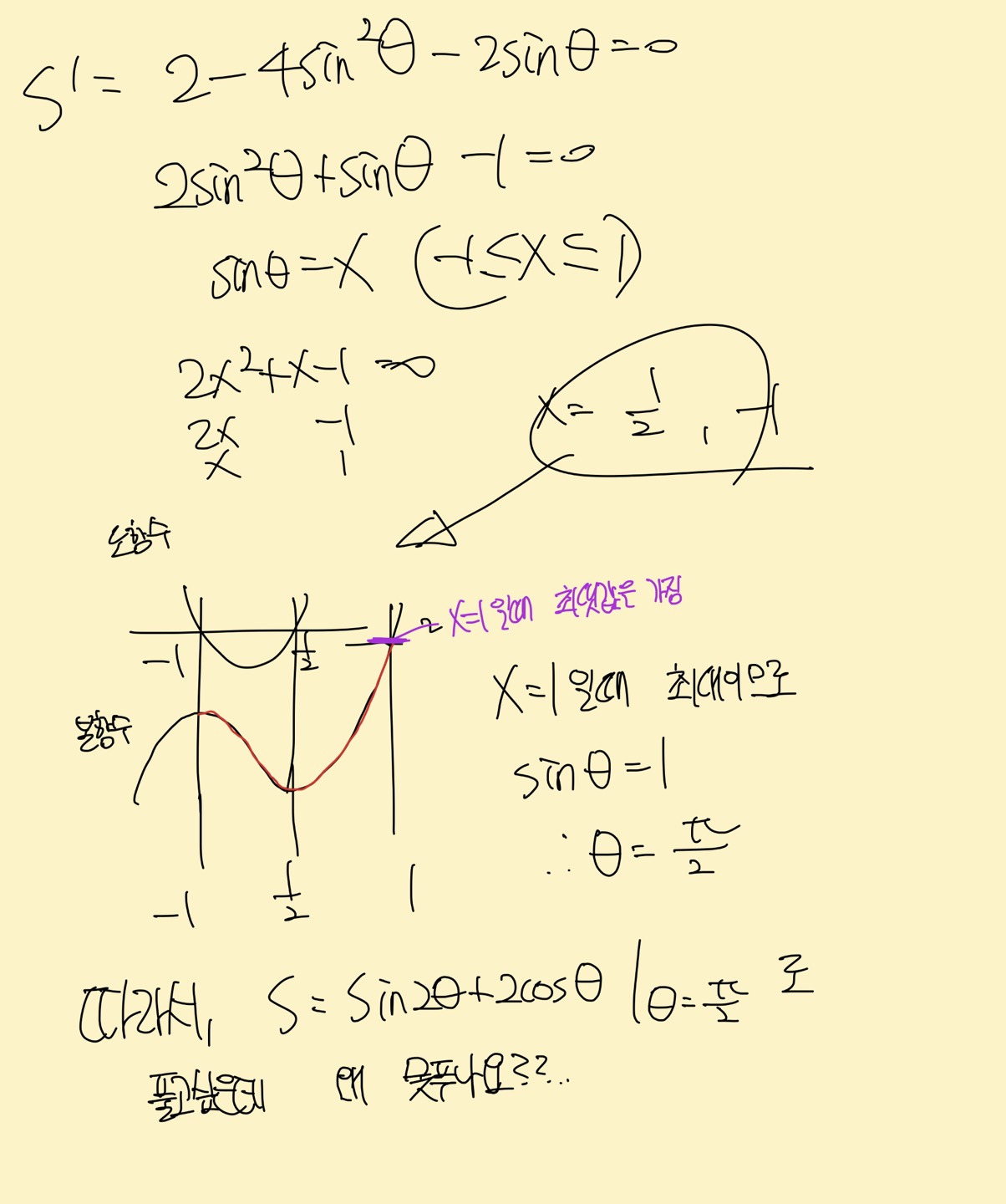 삼각함수값이 1이 0이라고 해도 결국 부호가 바껴야하는데 1보다 커질 수 없어서 부호가 바뀌지가 않아 극값이라 볼 수 없겠습니다.