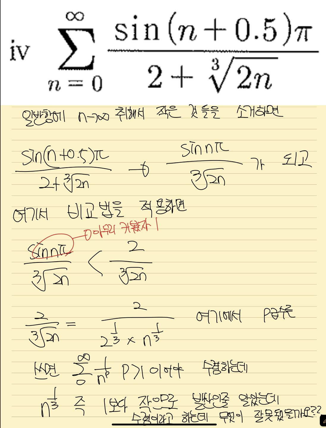 그럼 (-1)^n 이고 교대급수네요.. 교대급수는 작아지기만 하면 조건 수렴한다고 했죠?