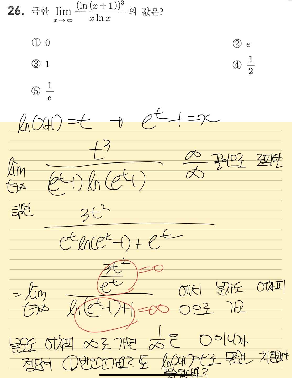 (lnx)^2 라 할지라도 x 에 비해 증가력이 작습니다. x가 더 큰 무한대이니까 0 ! |